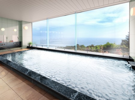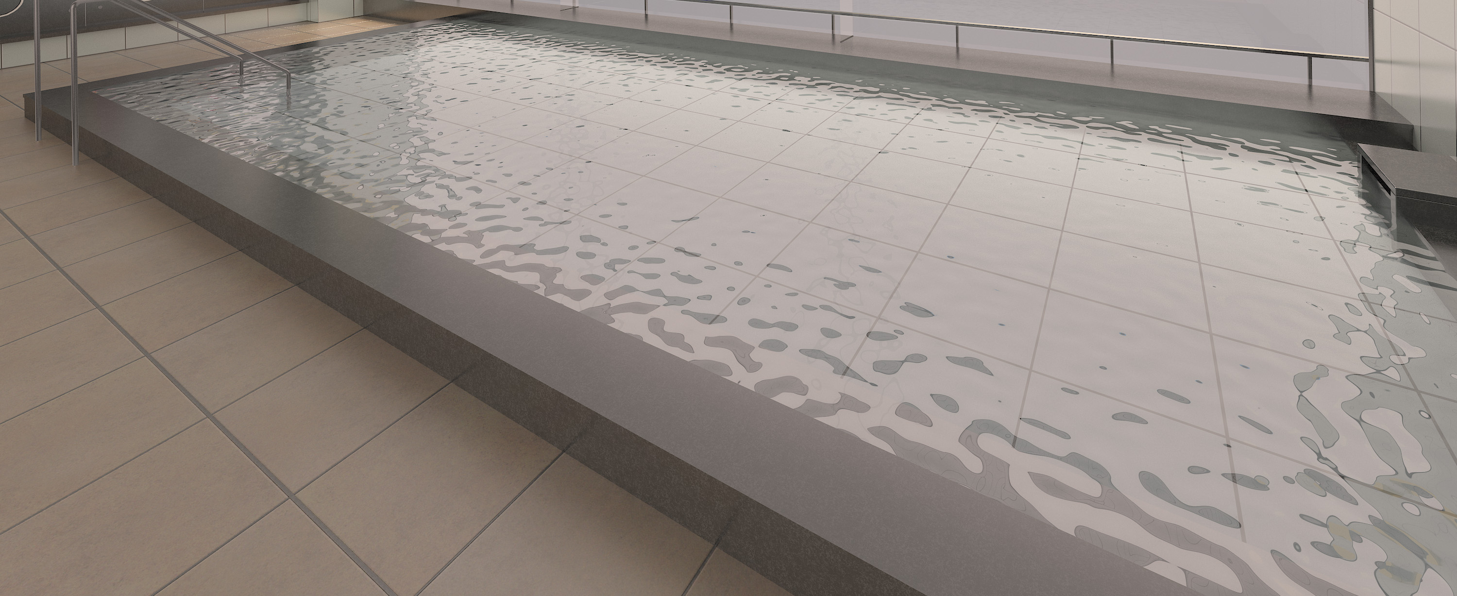 つまりはマテリアルの設定もその都度、様々な調整が必要となるということです。これは全てのマテリアルに共通していることですが、特にガラスや水、金属質なもの等、透明感や反射率の強いものがシーン・環境の影響を受けやすく、変化しやすいのではないでしょうか。今回のCGパースは大浴場ですので、透明感はありつつ、画面右端にお湯の吹出口があるので水面に揺らめきを与える必要があります。
