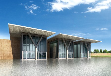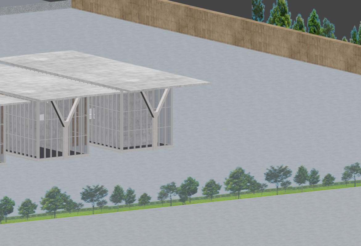 水の表現は微調整の計算時間が掛かるので後回しにして、他の部分を詰めていきます。とはいえ、他に難しい調整も無いのでさくさく進めます。今回、ガラス面が広い割には写り込むものが無いので対岸に植栽を配置してガラスに表現します。植栽をモデリングで置くと計算時間が延びますので、今回程度のアングルとガラスへの写り込み表現だけなら、マテリアルで処理します。