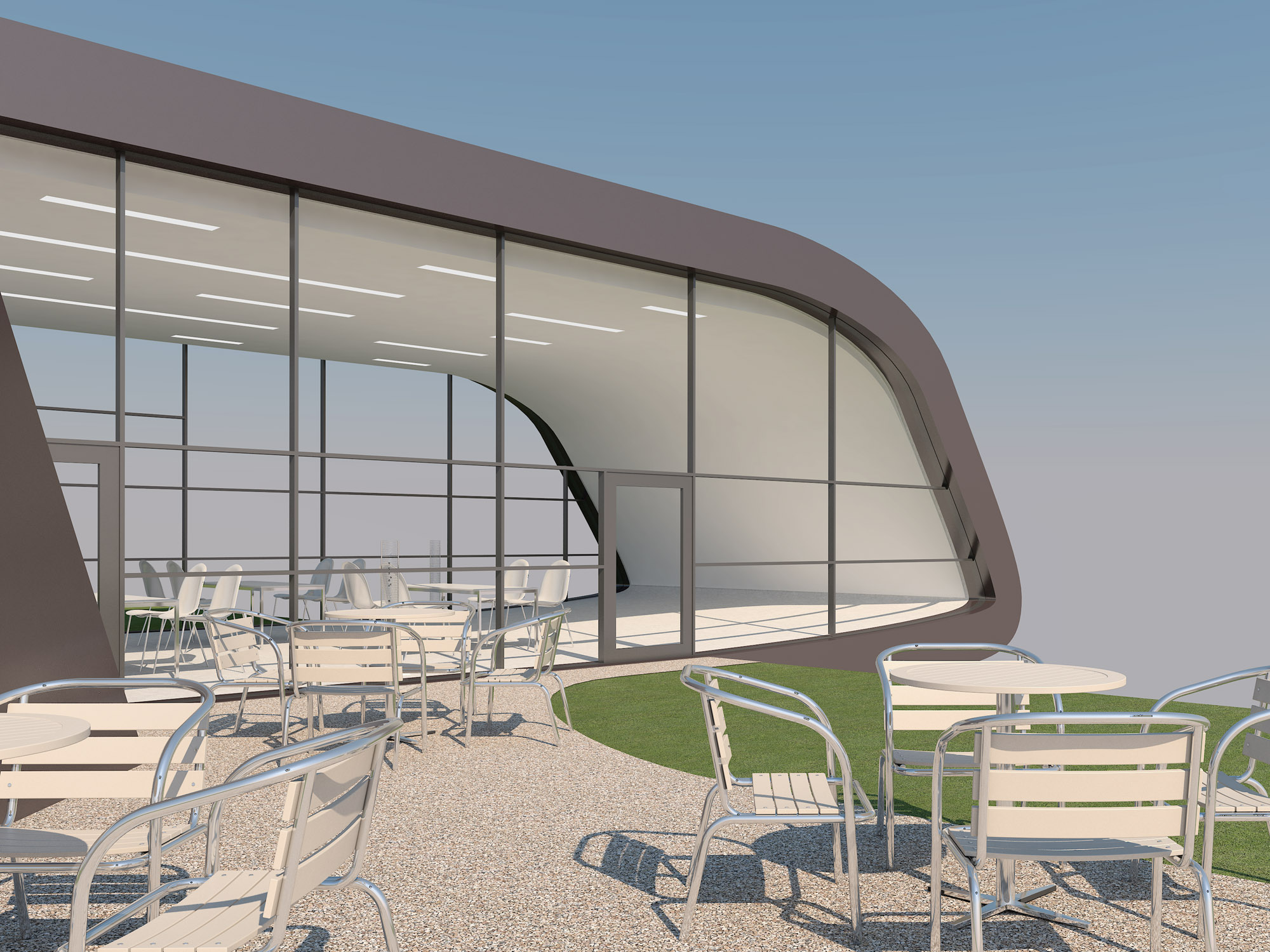 今回のCGパース作成時のスタディとして選んだのは、海外の美術館で、ガラスの質感、それから金属の質感も演出しようと思い、手前に家具を配置してみました。