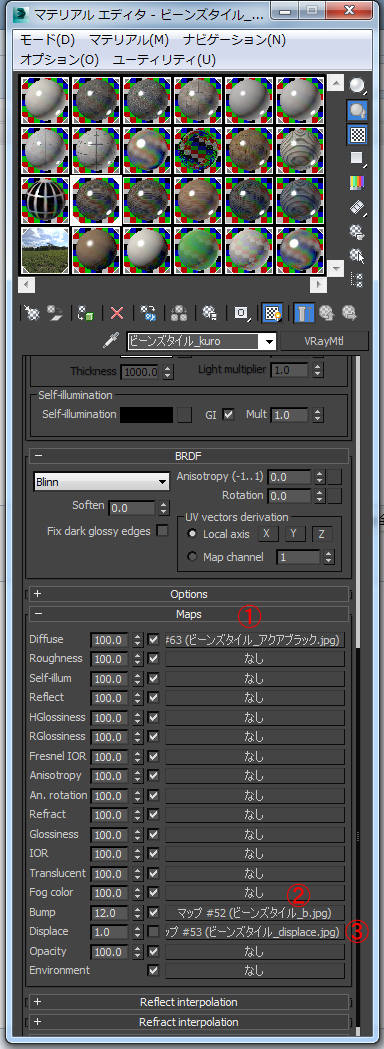 マップを読み込んで、数値を設定したら、マテリアルの反射値をちょっと上げて、Refl.glossiness(光沢度)を0.8くらいに調整します。