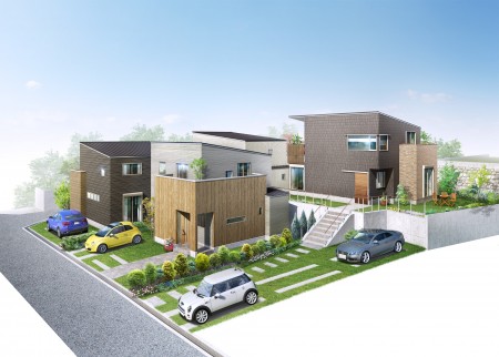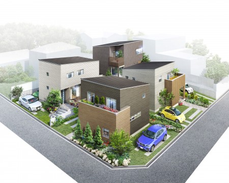 4区画の住宅外観パース、鳥瞰と半鳥瞰で二つの角度で制作しました。