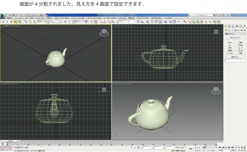 3dsmaxでは表示画面を1~4画面に分割することが出来ます。