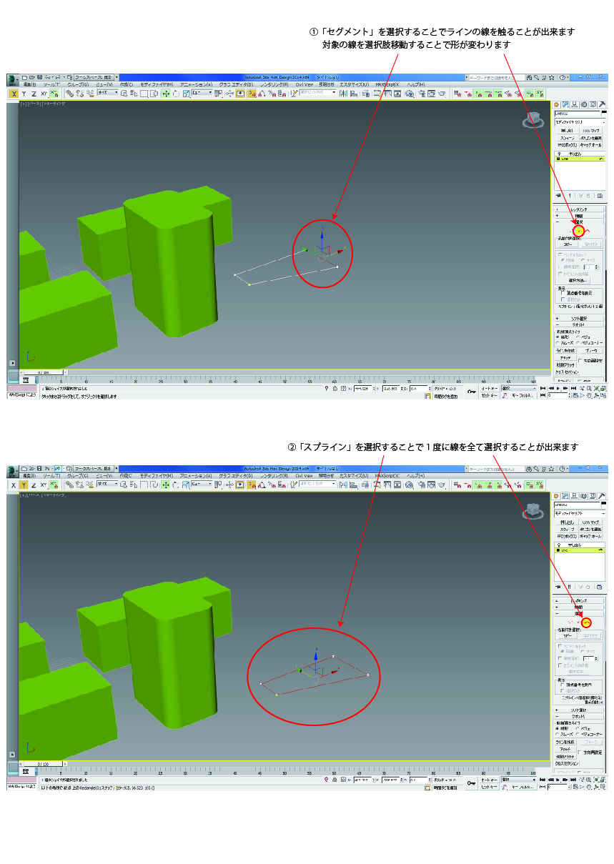 「スプライン」を選択することで1度に線を全て選択することが出来ます