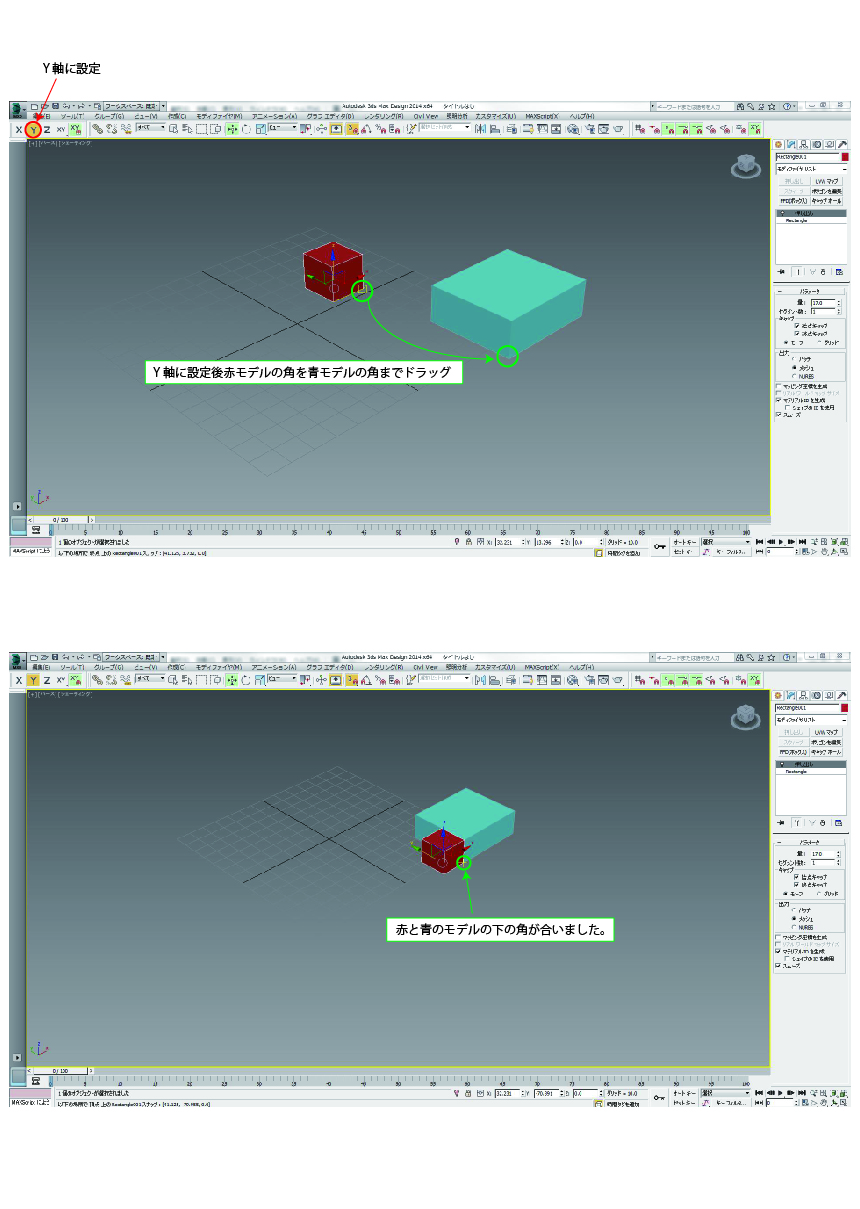 赤モデルをもう一度手前の角と下面を合わせる位置に移動させます。