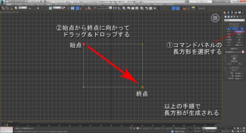 まずビューポートをトップにし、コマンドパネルより「長方形」を選択します。