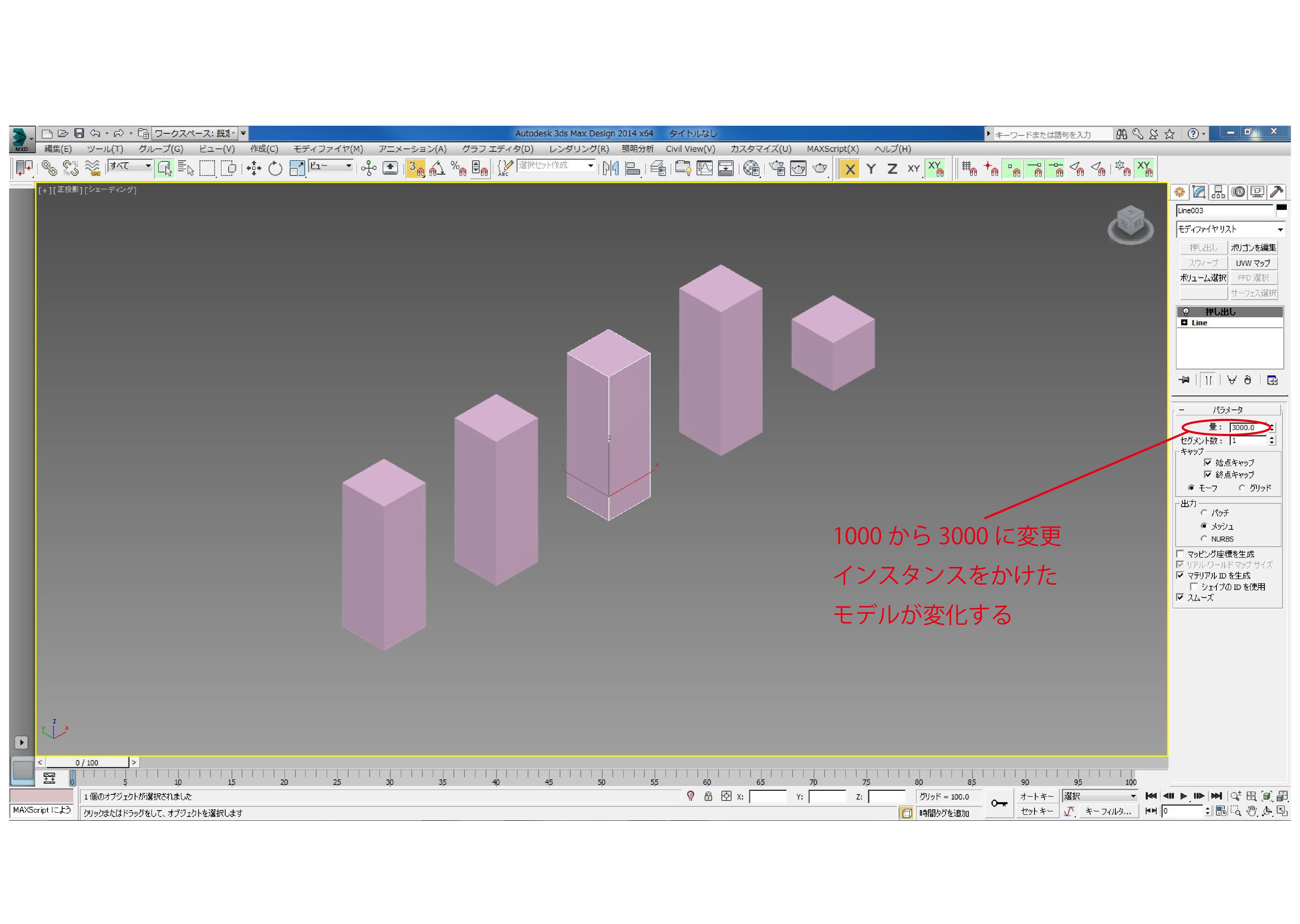 たとえばインスタンスで複製した立方体の高さを1000から3000に変えます。