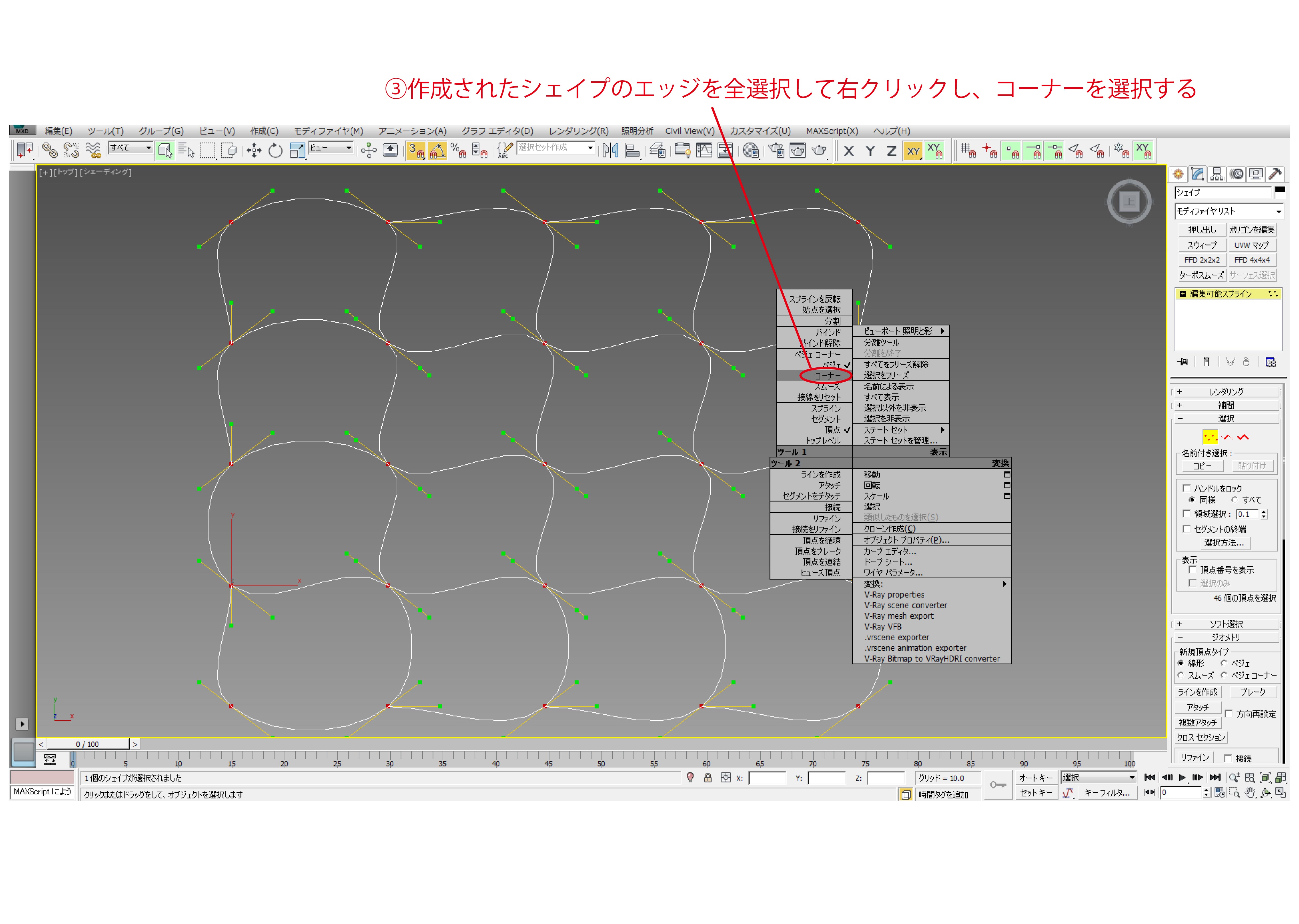 ③作成されたシェイプのエッジを全選択して右クリックし、コーナーを選択する