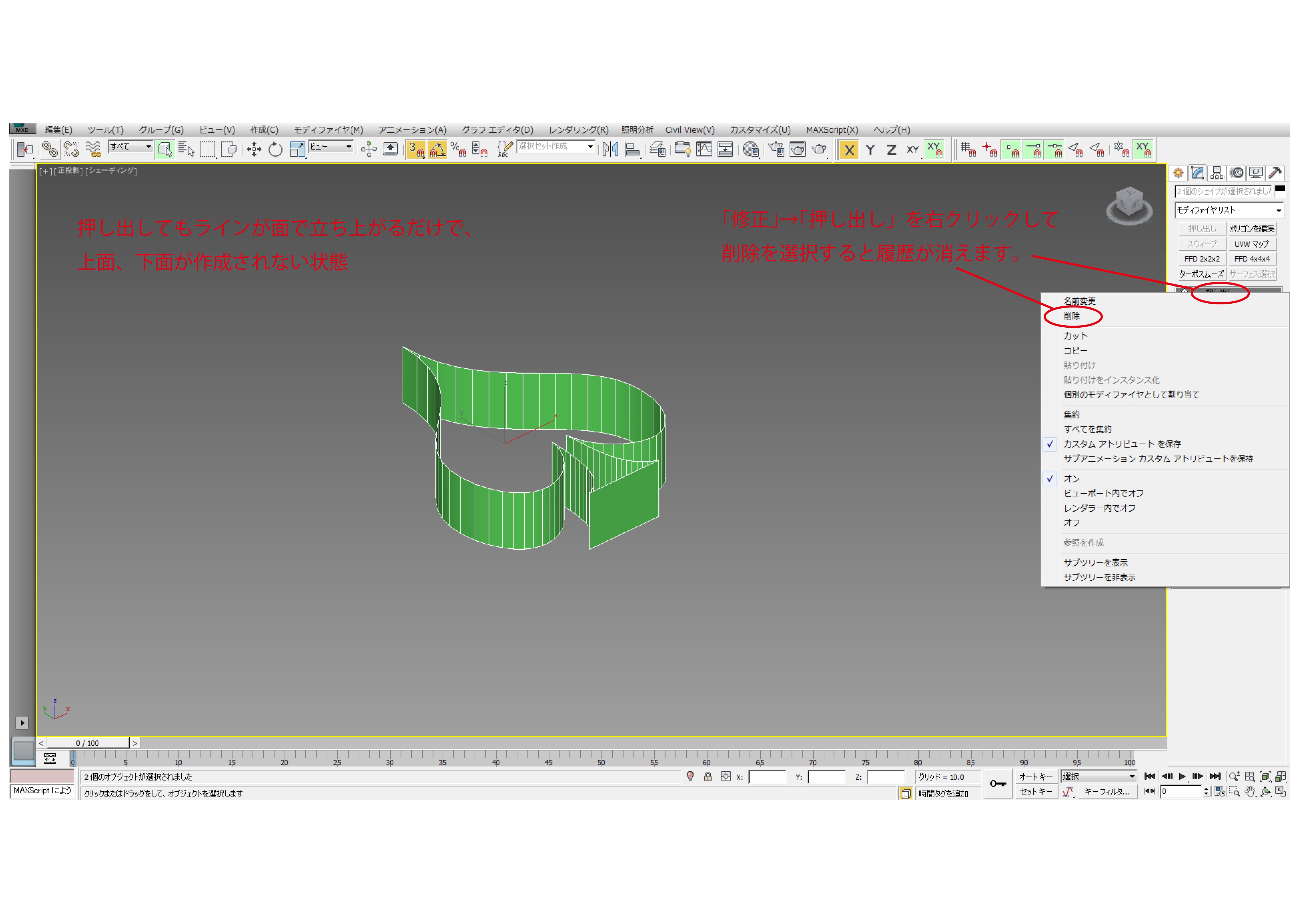 「修正」→「押し出し」を右クリックして削除を選択すると履歴が消えます。