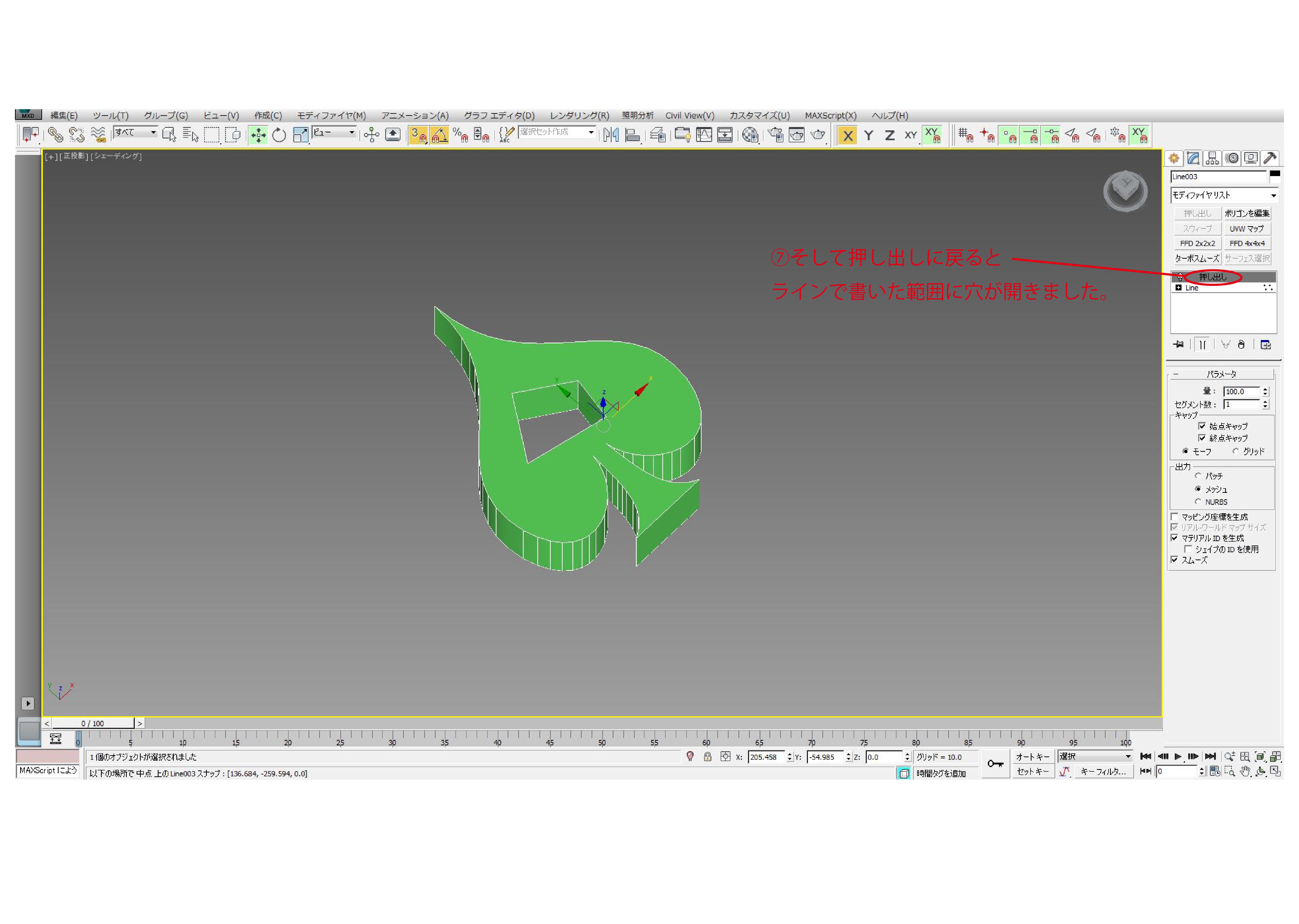 ⑦そして押し出しに戻るとラインで書いた範囲に穴が開きました。