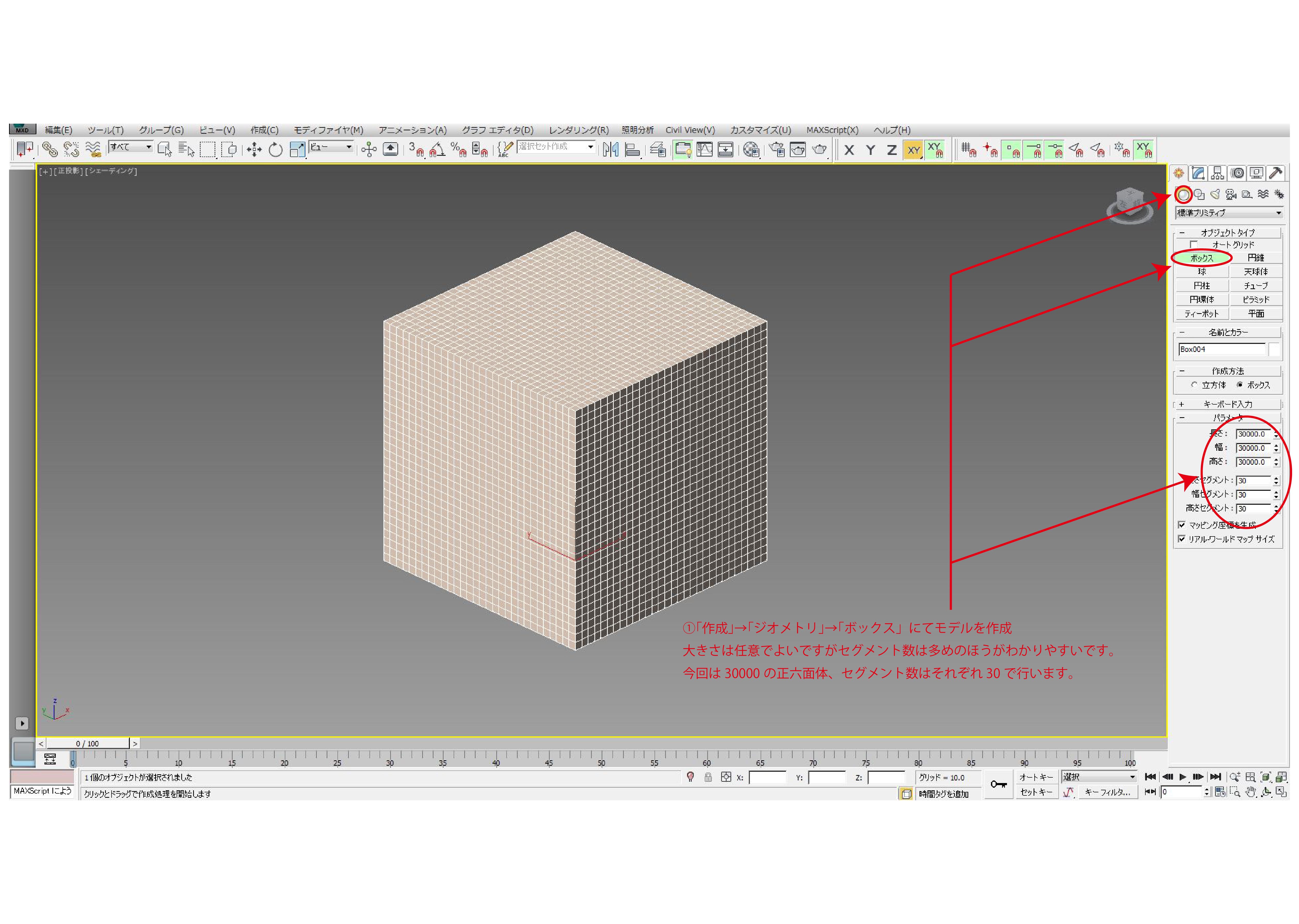 今回は30000の正六面体、セグメント数はそれぞれ30で行います。