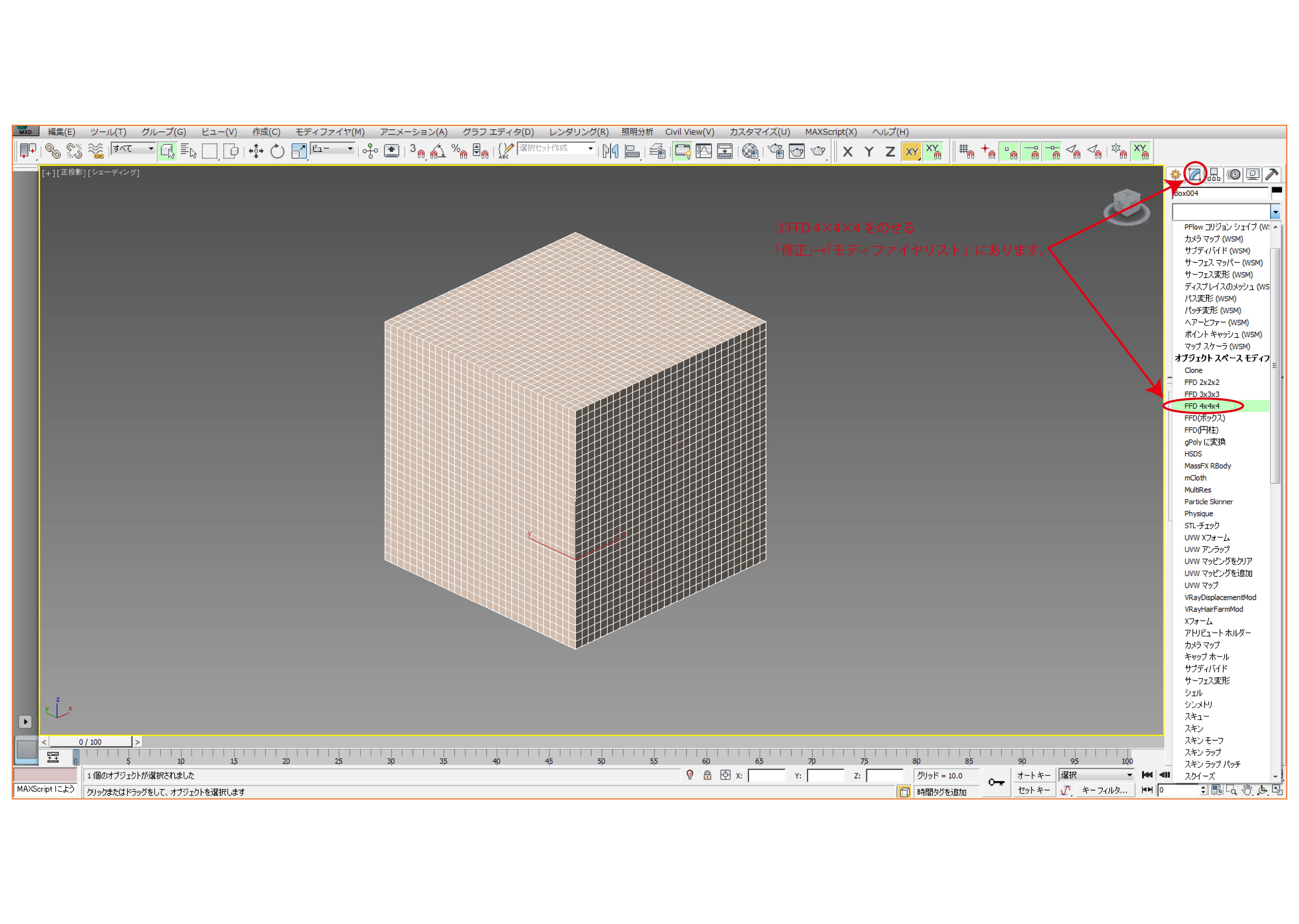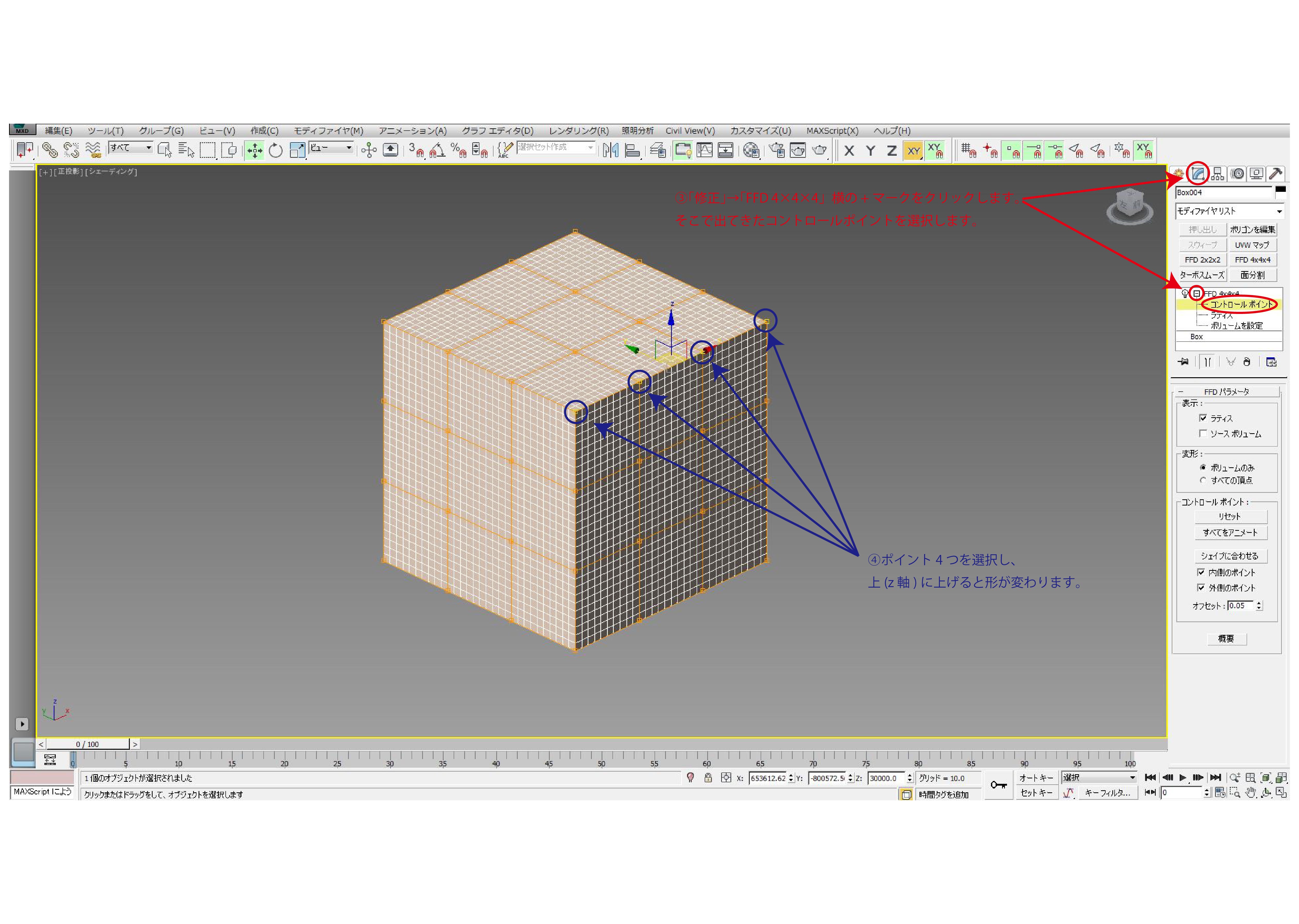 ③「修正」→「FFD 4×4×4」横の+マークをクリックします。