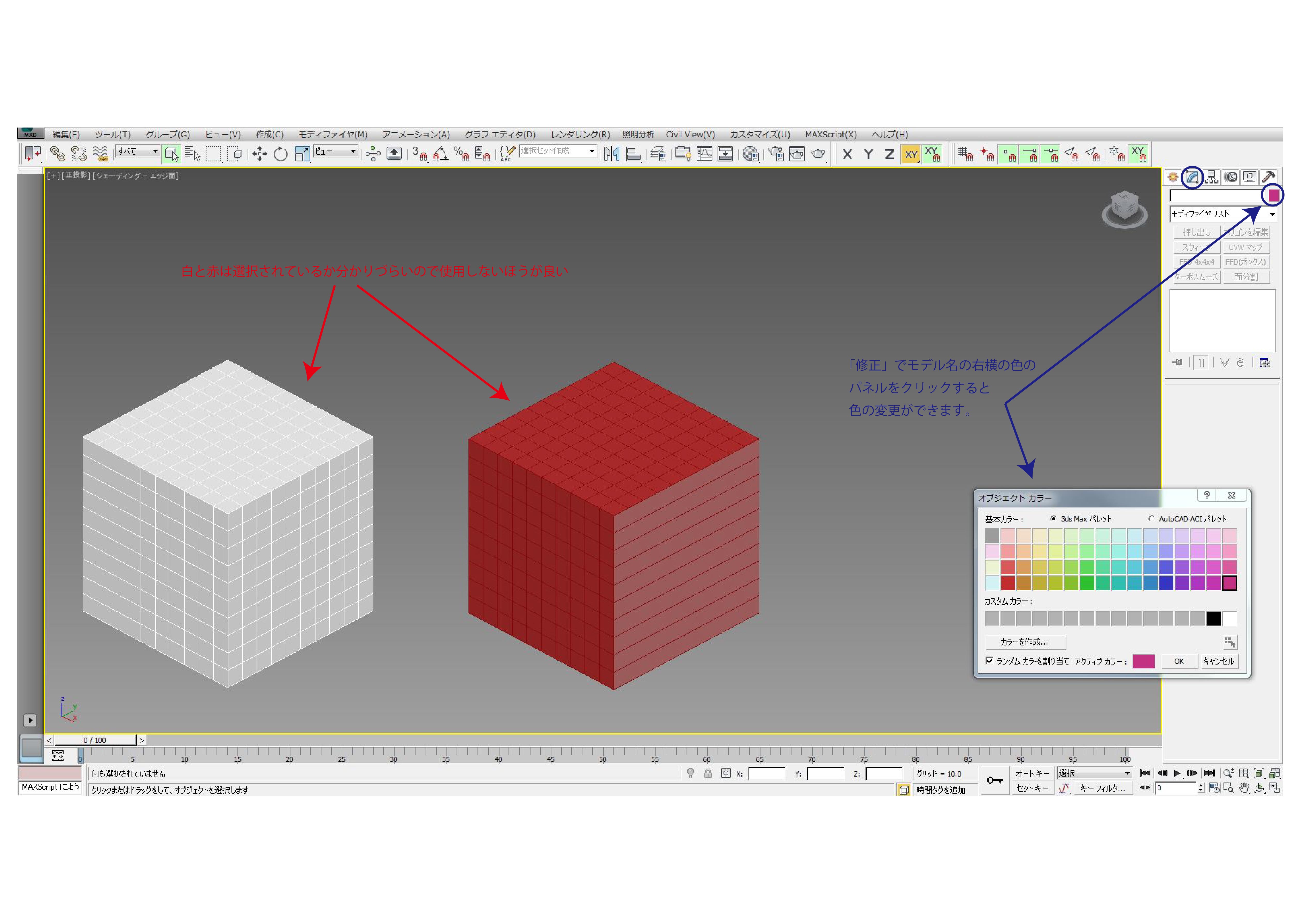 モデルの色について、結論から言いますと白系統、赤系統の色での作業はお勧めできません。