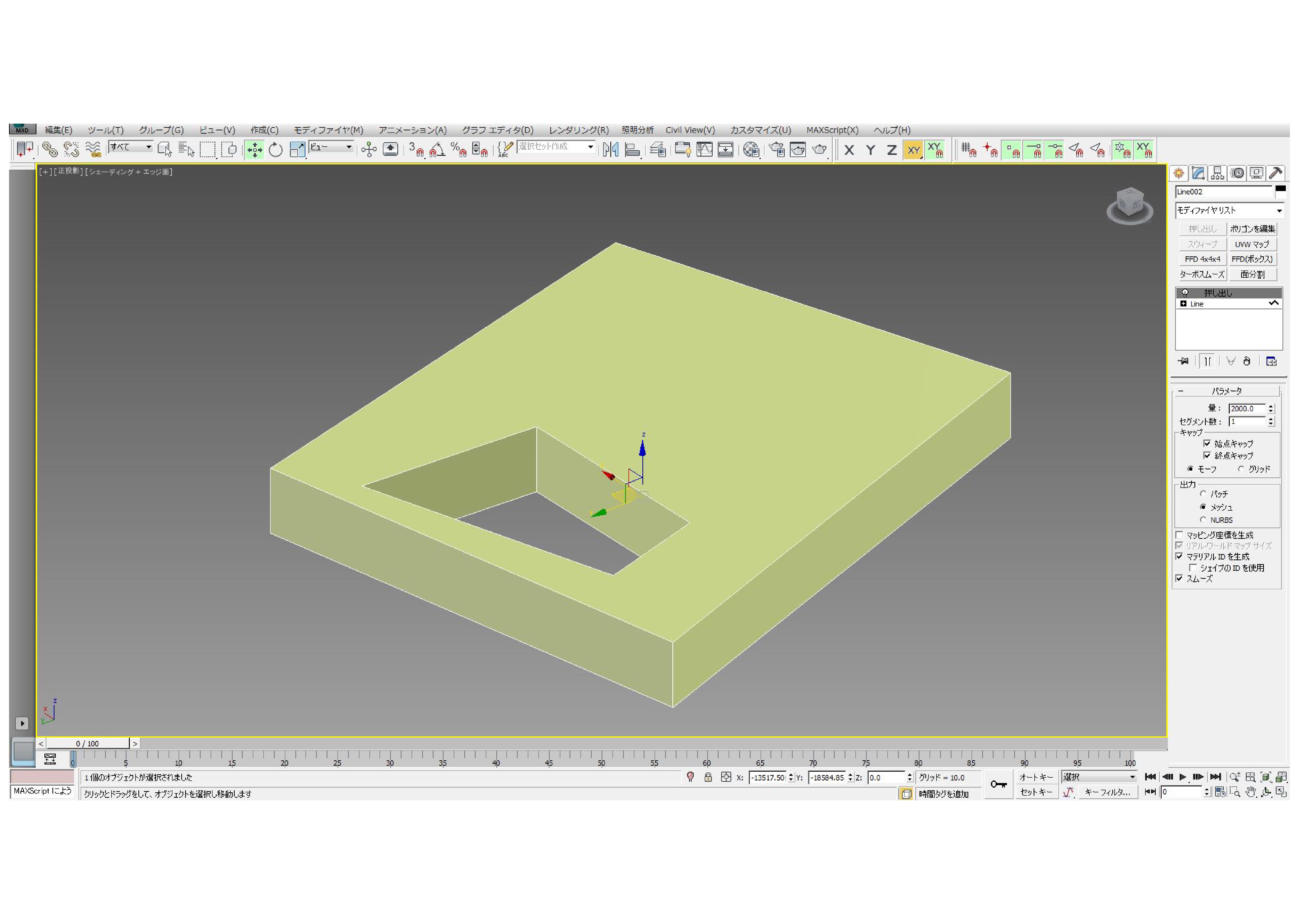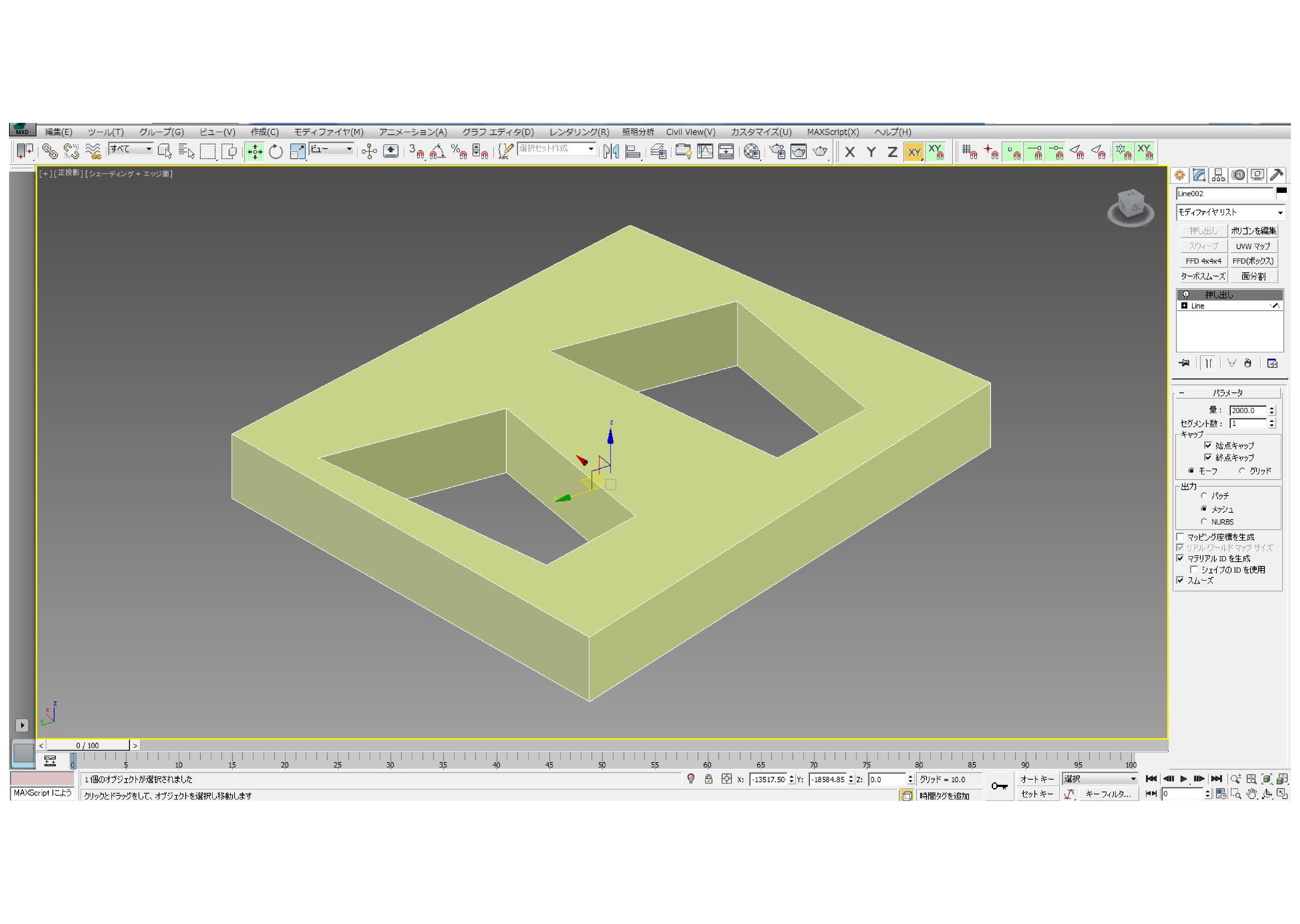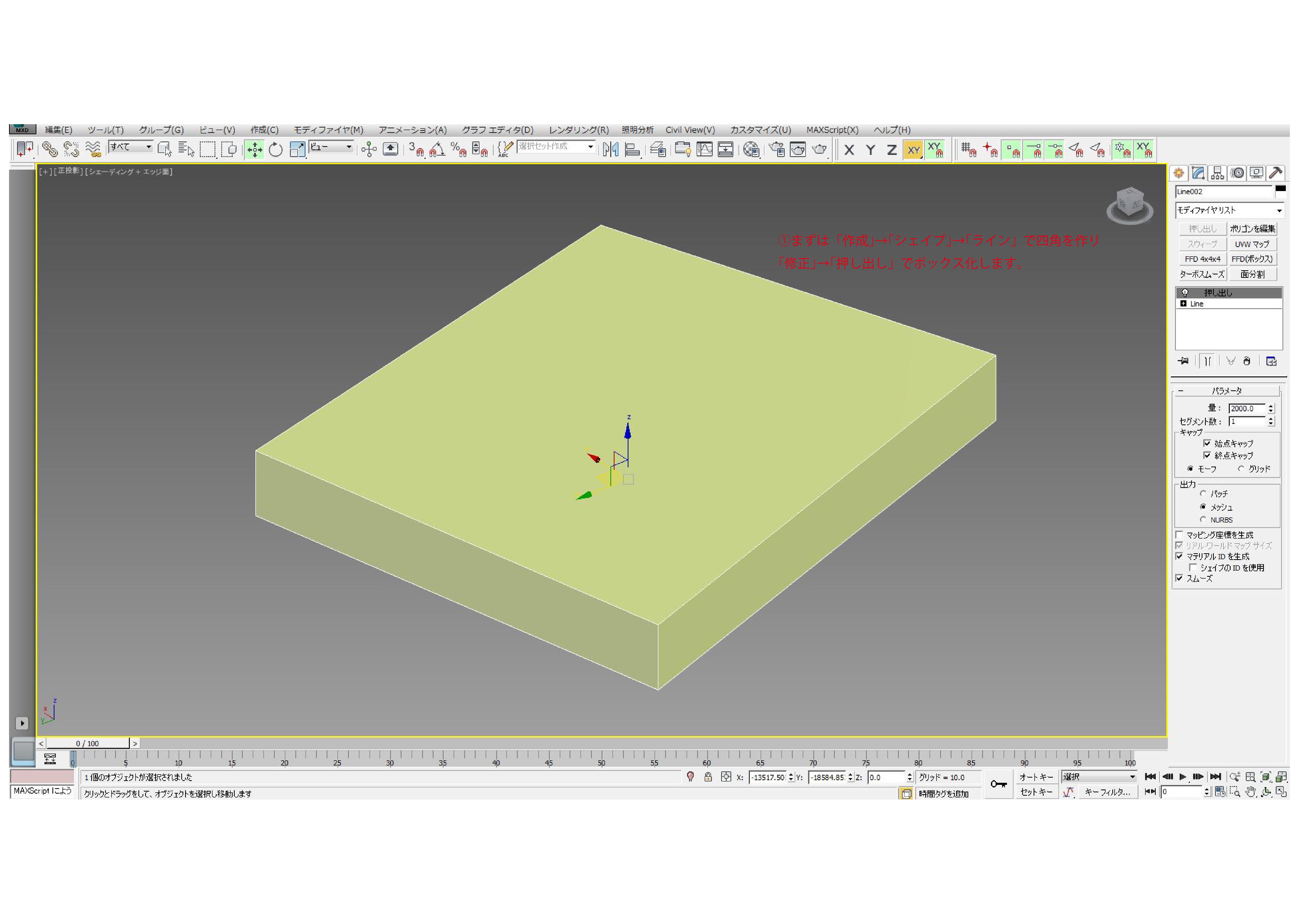 ①まずは「作成」→「シェイプ」→「ライン」で四角を作り「修正」→「押し出し」でボックス化します。