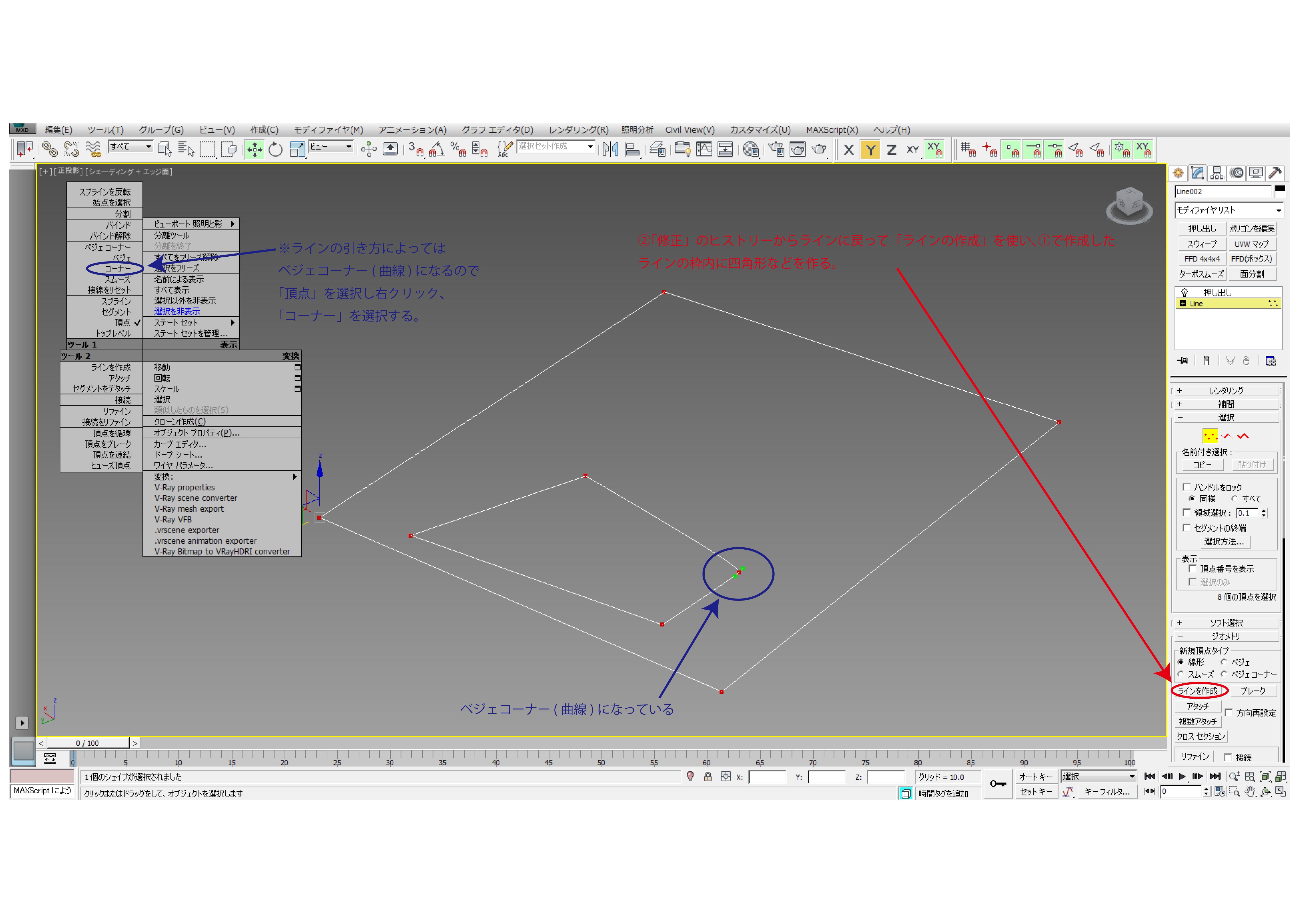 ※ラインの引き方によってはベジェコーナー(曲線)になるので「頂点」を選択し右クリック、
