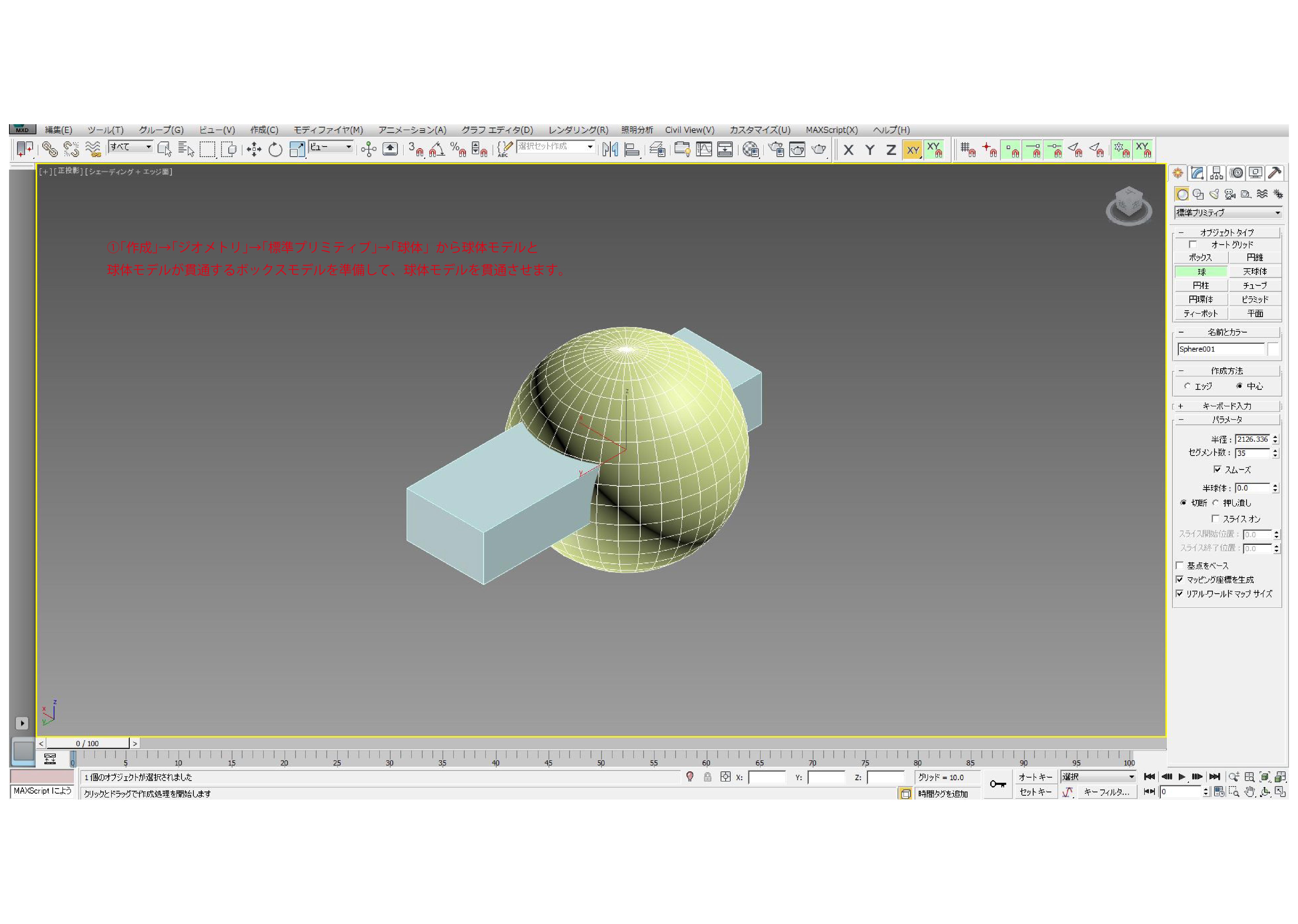 ①「作成」→「ジオメトリ」→「標準プリミティブ」→「球体」から球体モデルと