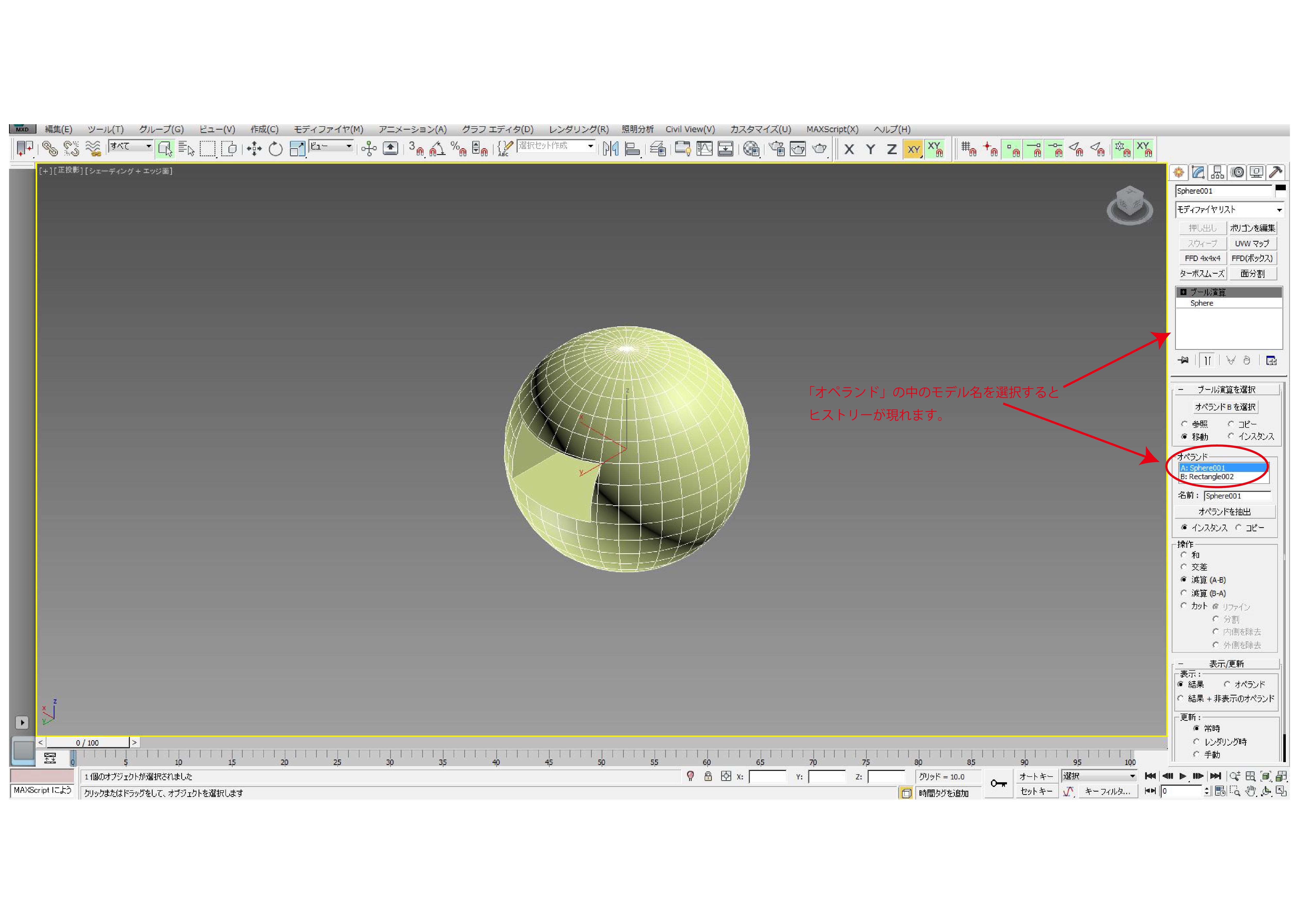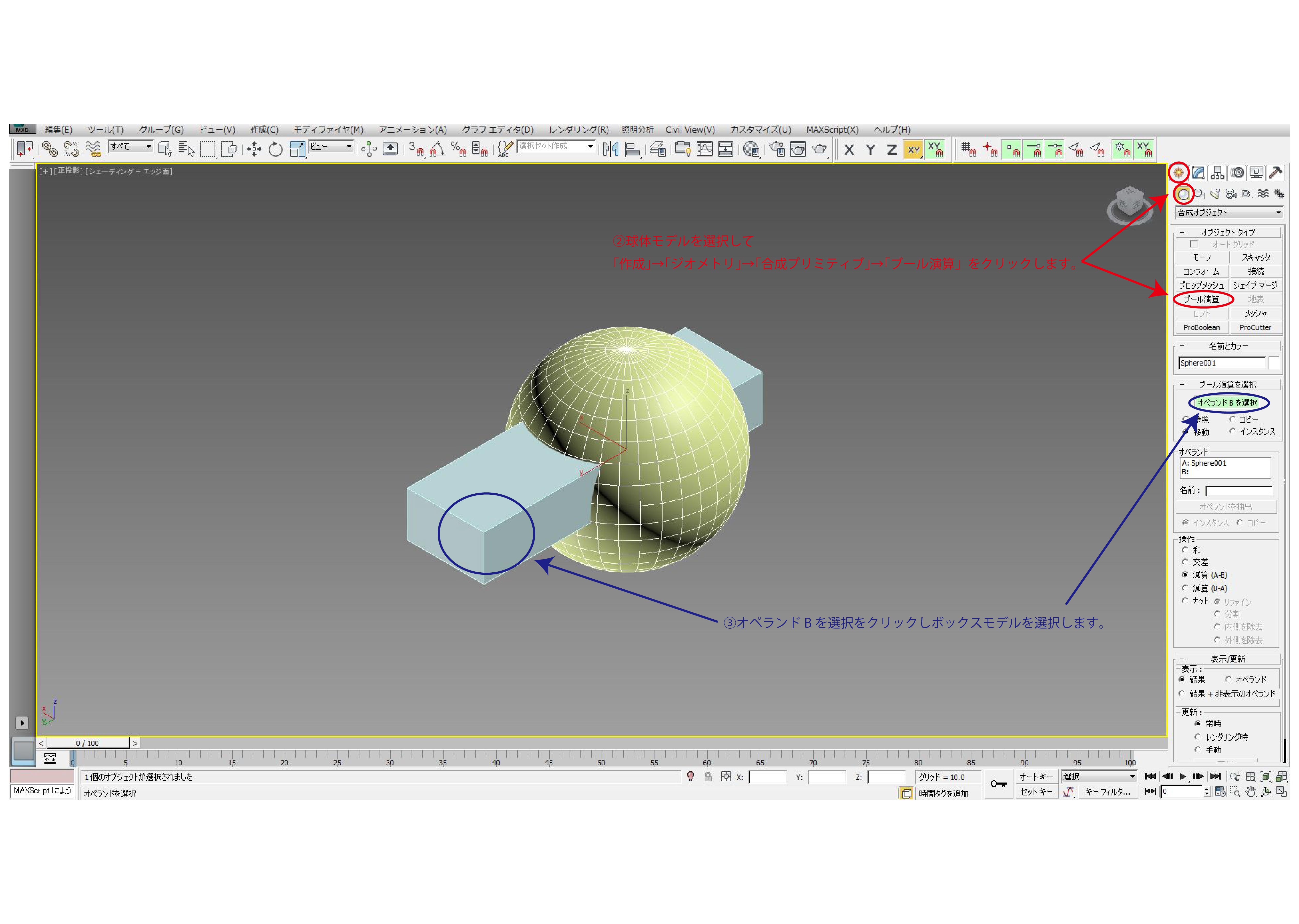 ②球体モデルを選択して「作成」→「ジオメトリ」→「合成プリミティブ」→「ブール演算」をクリックします。