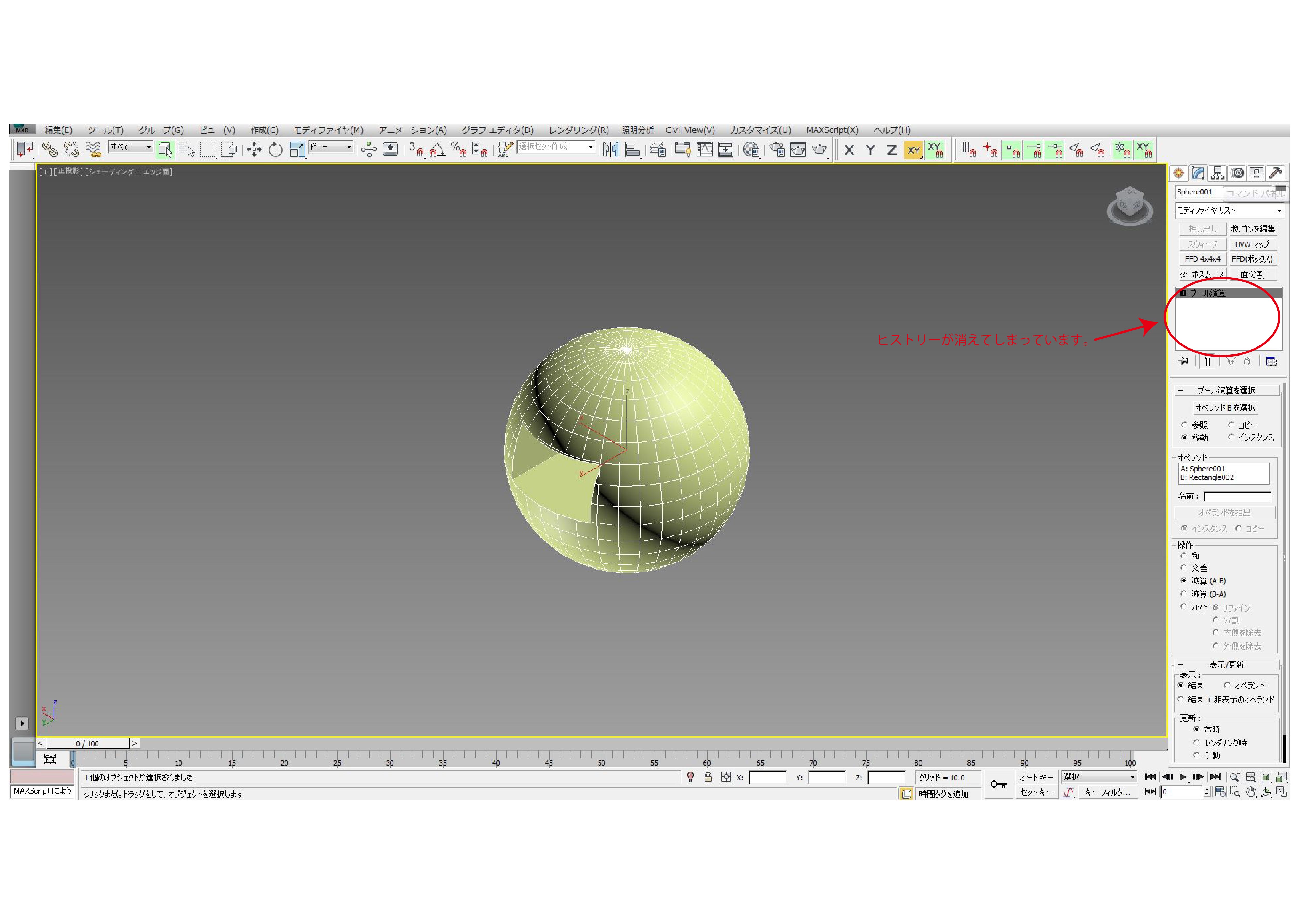 ④下の「操作」の中の減算(A-B)にチェックをつけると球体にボックスモデルの形の穴が開きました。