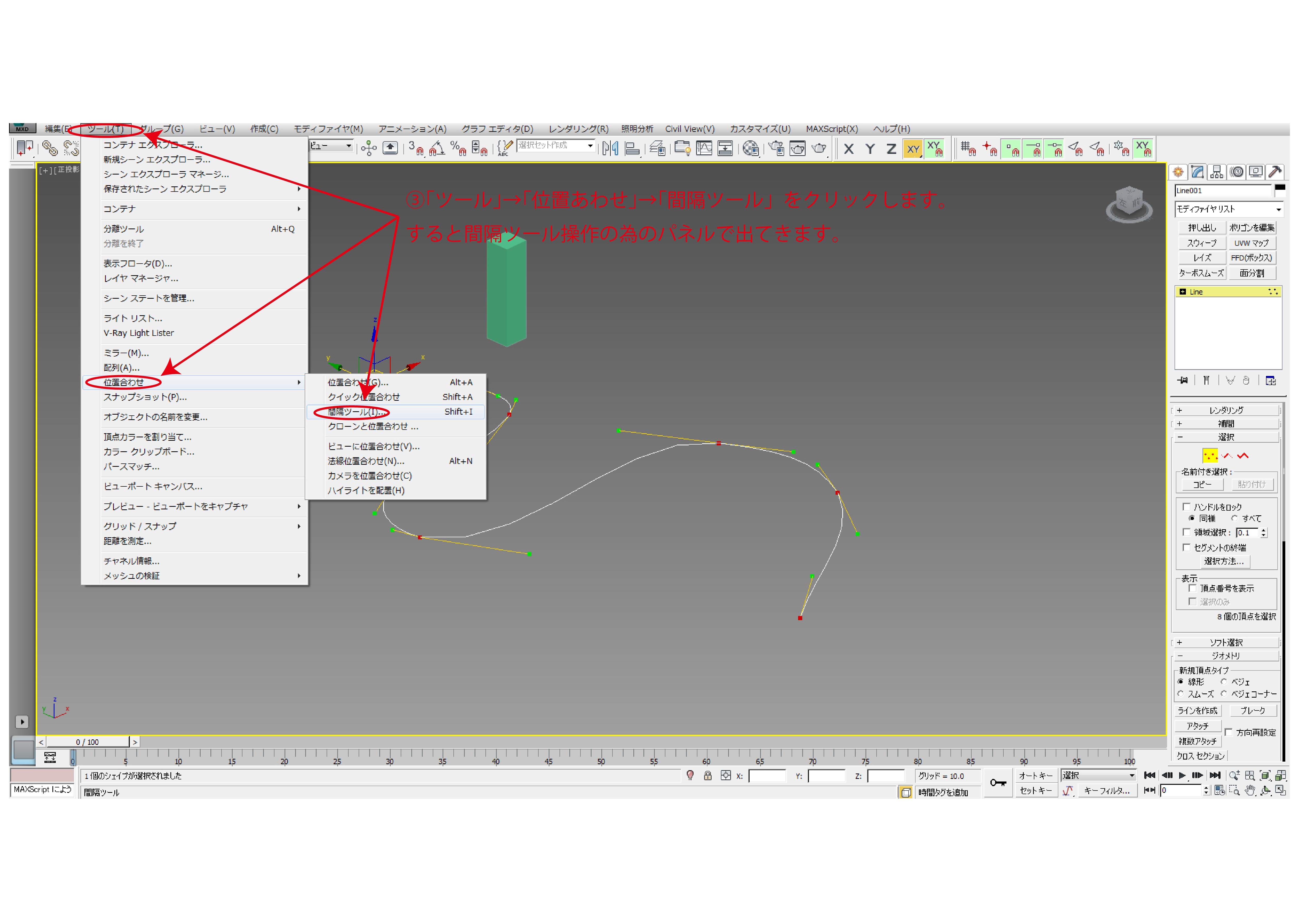 ③「ツール」→「位置あわせ」→「間隔ツール」をクリックします。