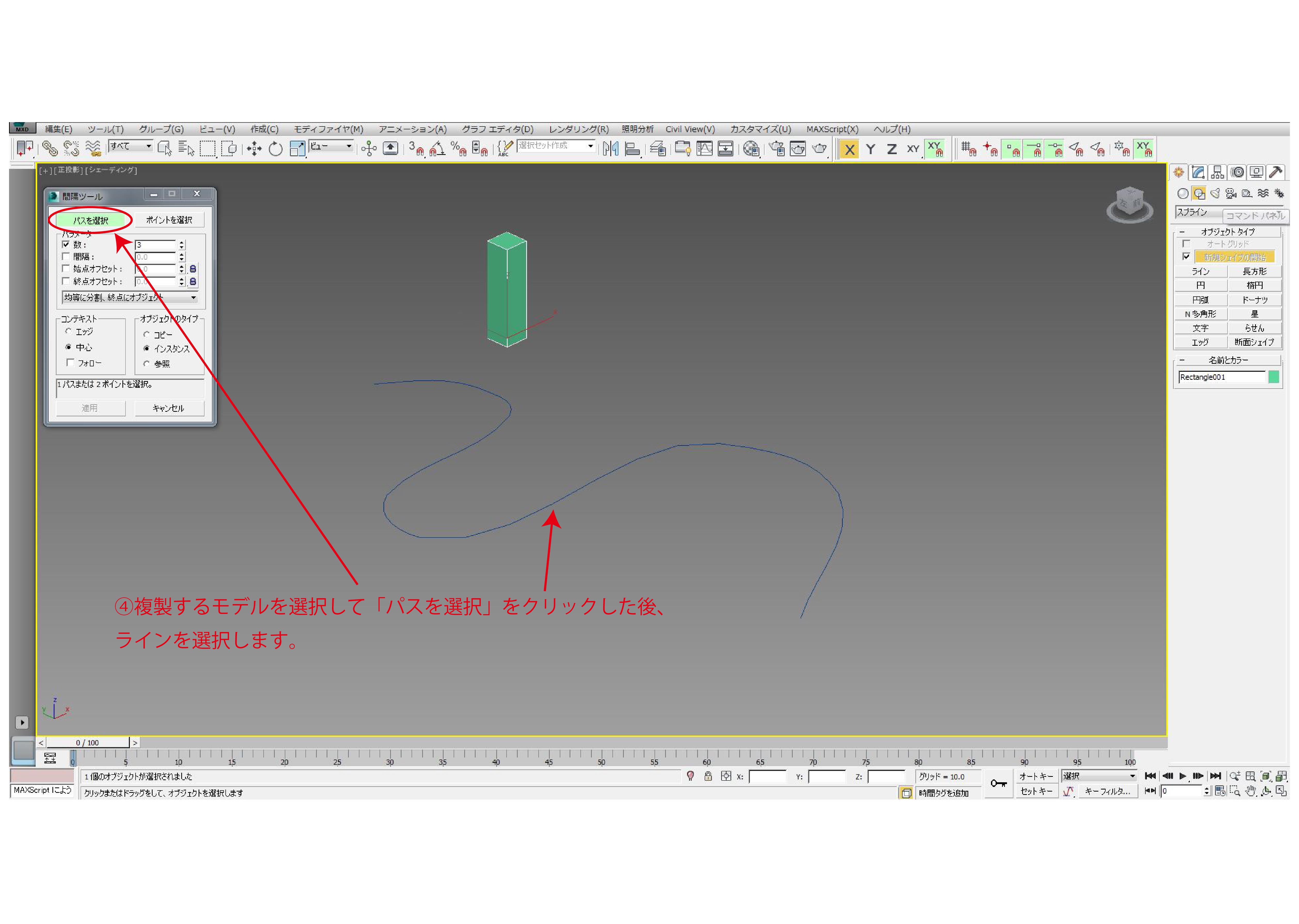 ④複製するモデルを選択して「パスを選択」をクリックした後、ラインを選択します。