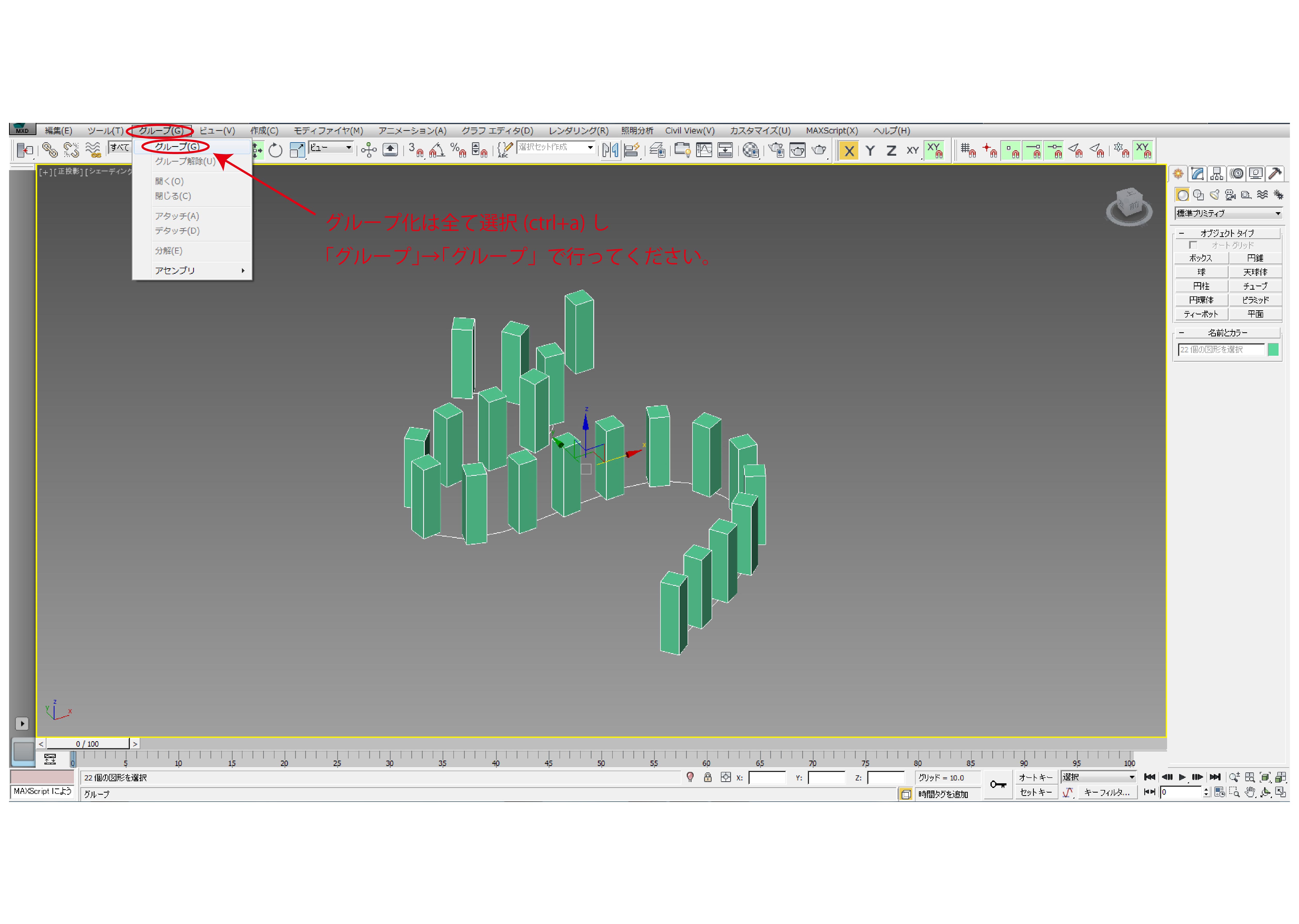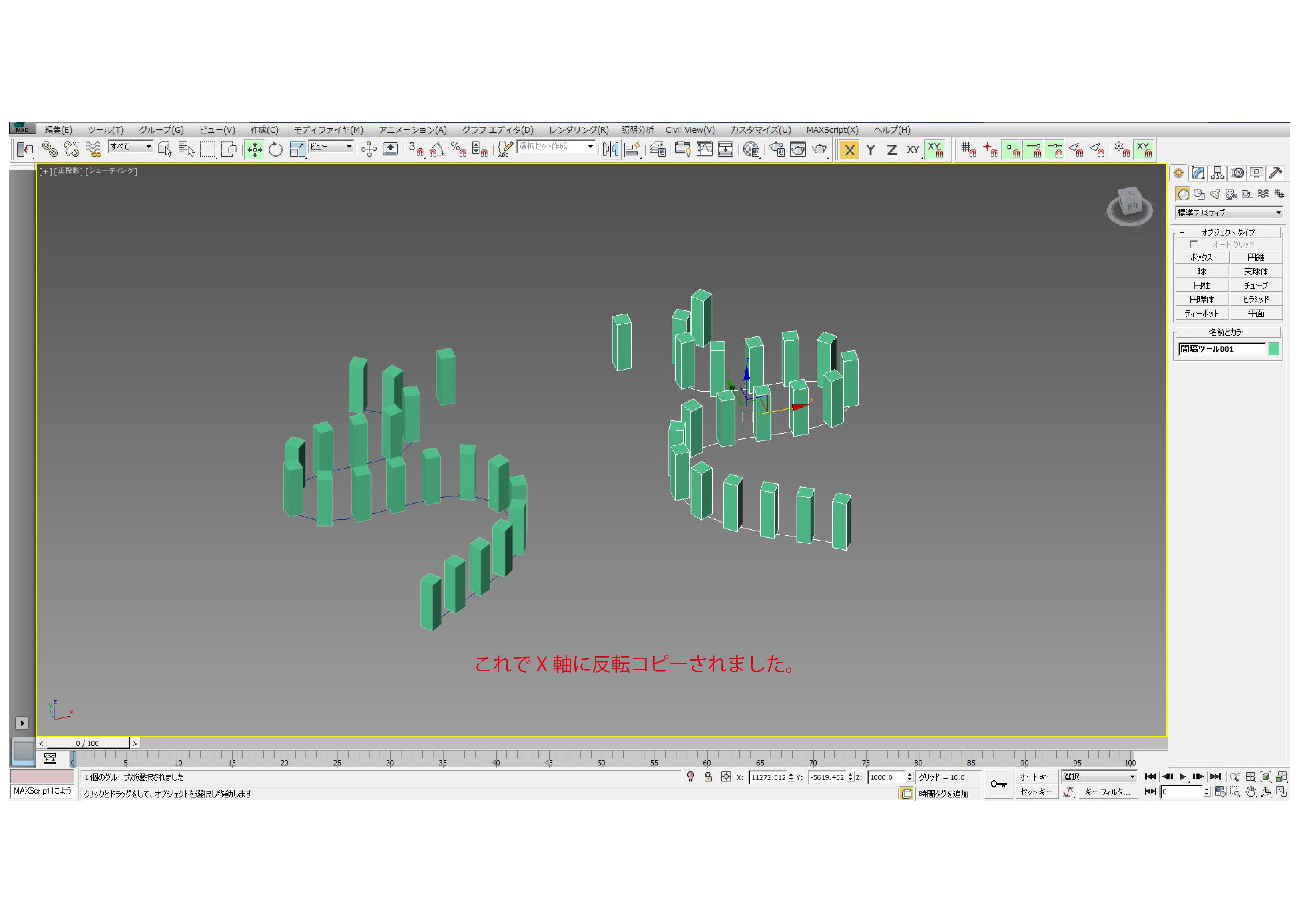 せっかくですので複製するモデルは、先ほど間隔ツールで作成したモデルをグループ化して使用しましょう。