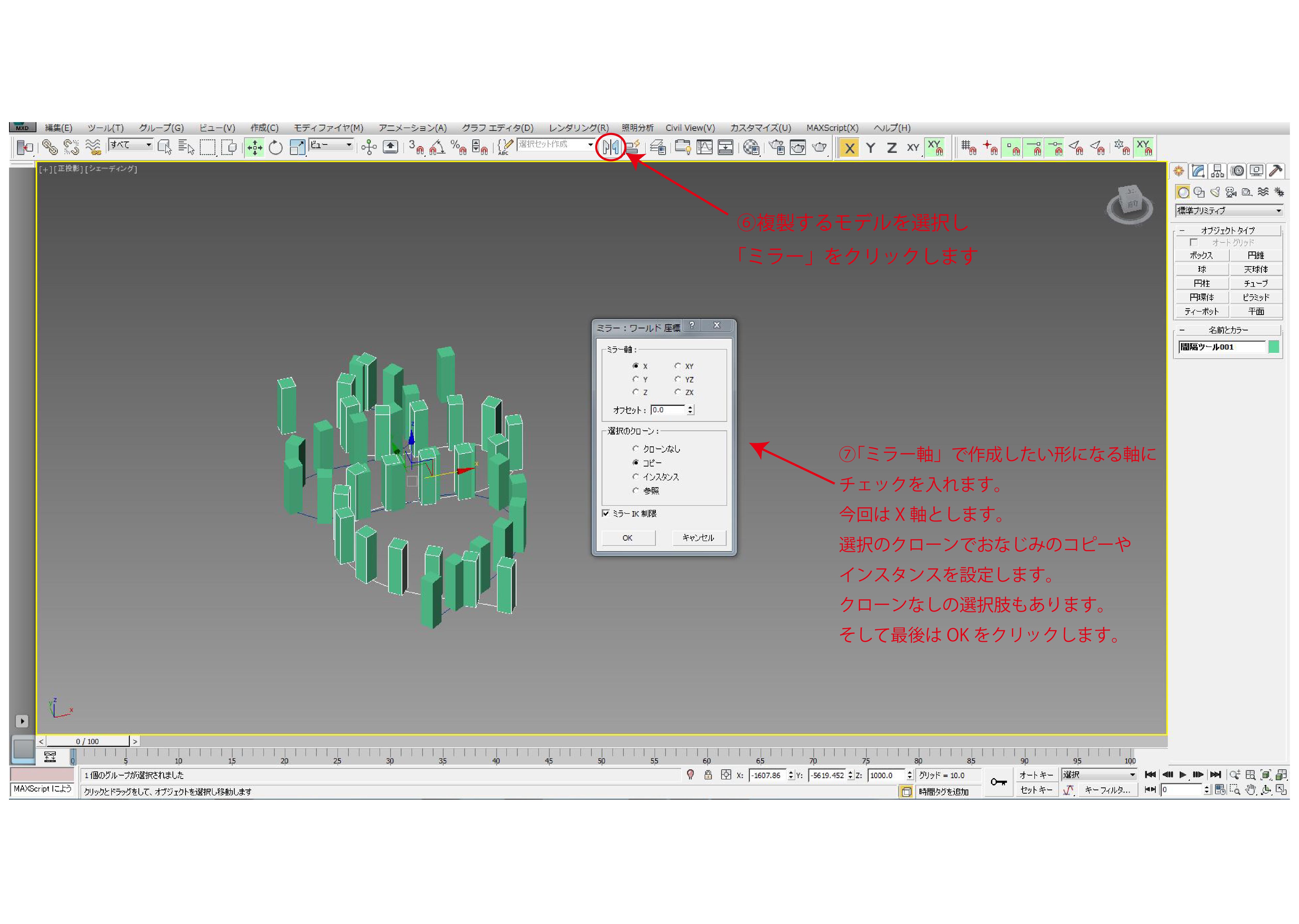 ⑥複製するモデルを選択し「ミラー」をクリックします。