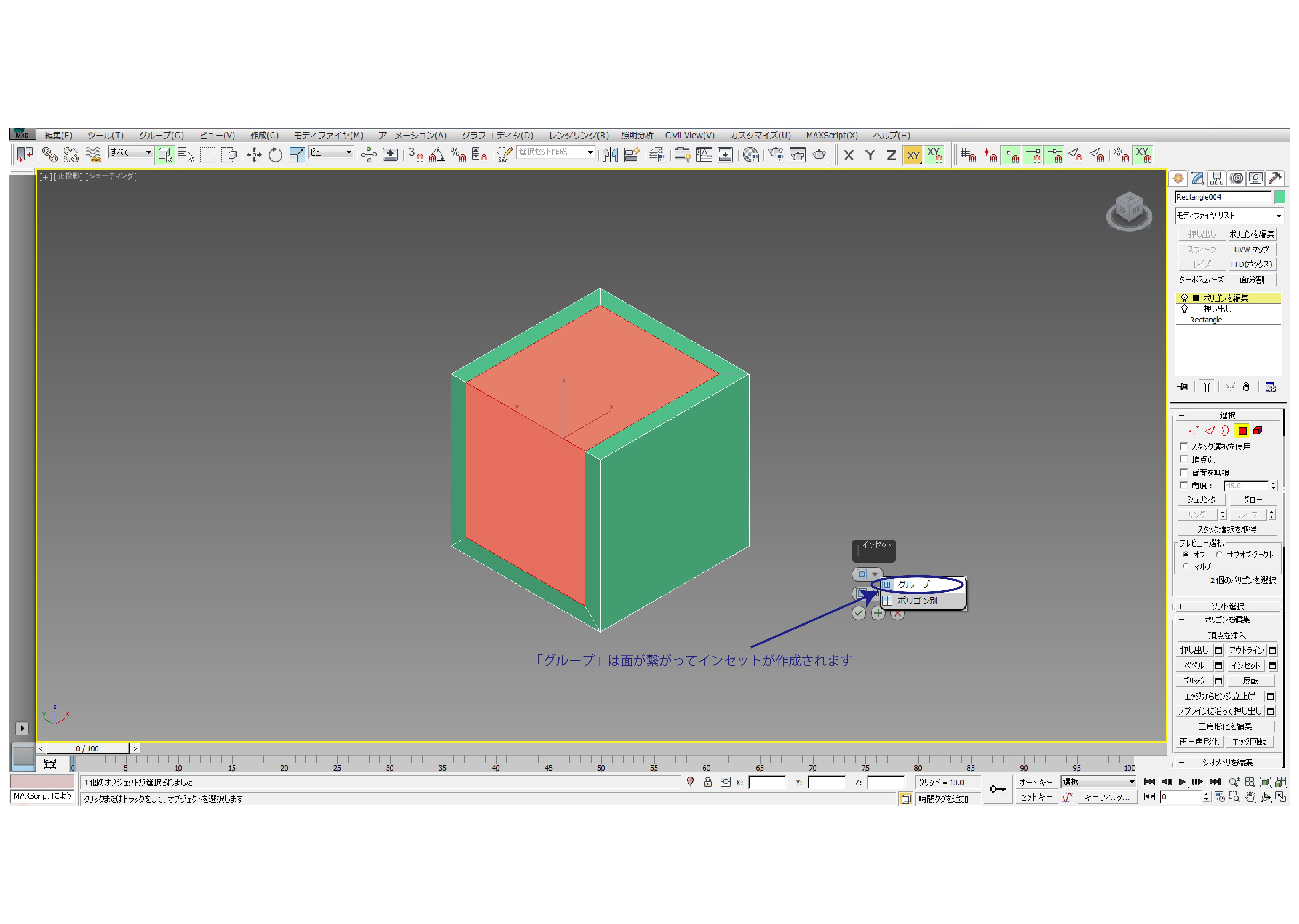 「グループ」は面が繋がってインセットが作成されます。
