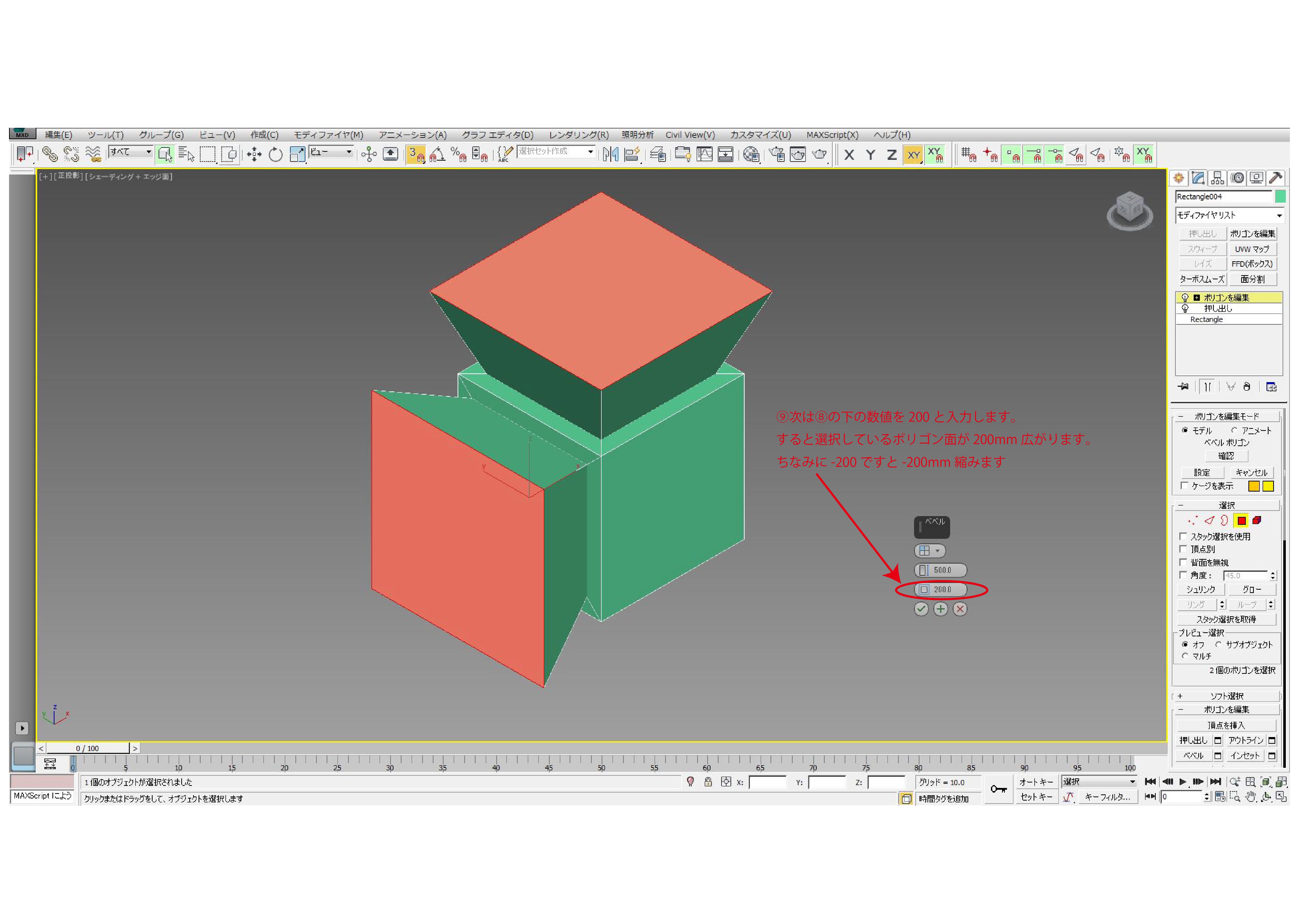 すると選択しているポリゴン面が200mm広がります。