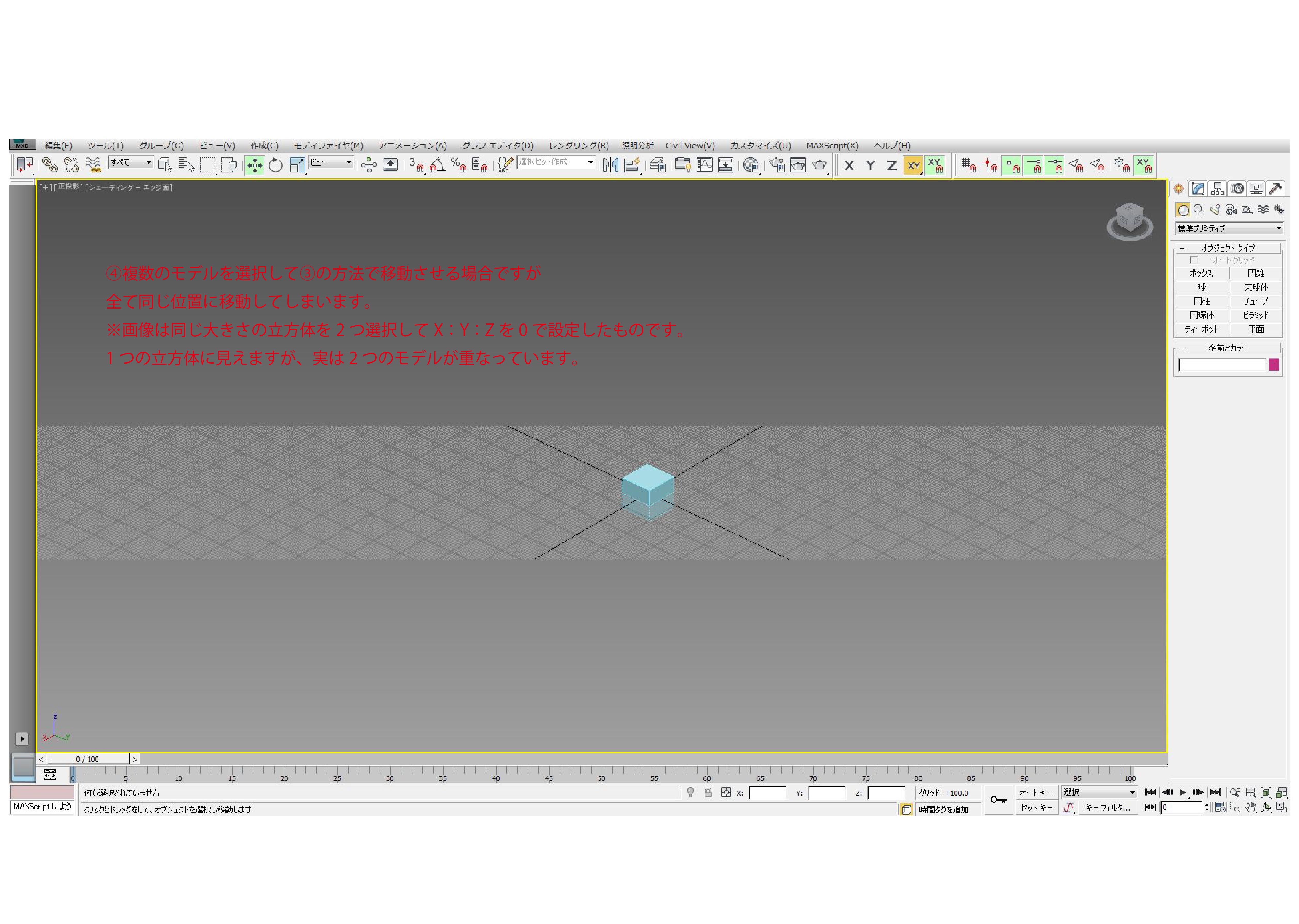 ※下画像は同じ大きさの立方体を2つ選択してX:Y:Zを0で設定したものです。