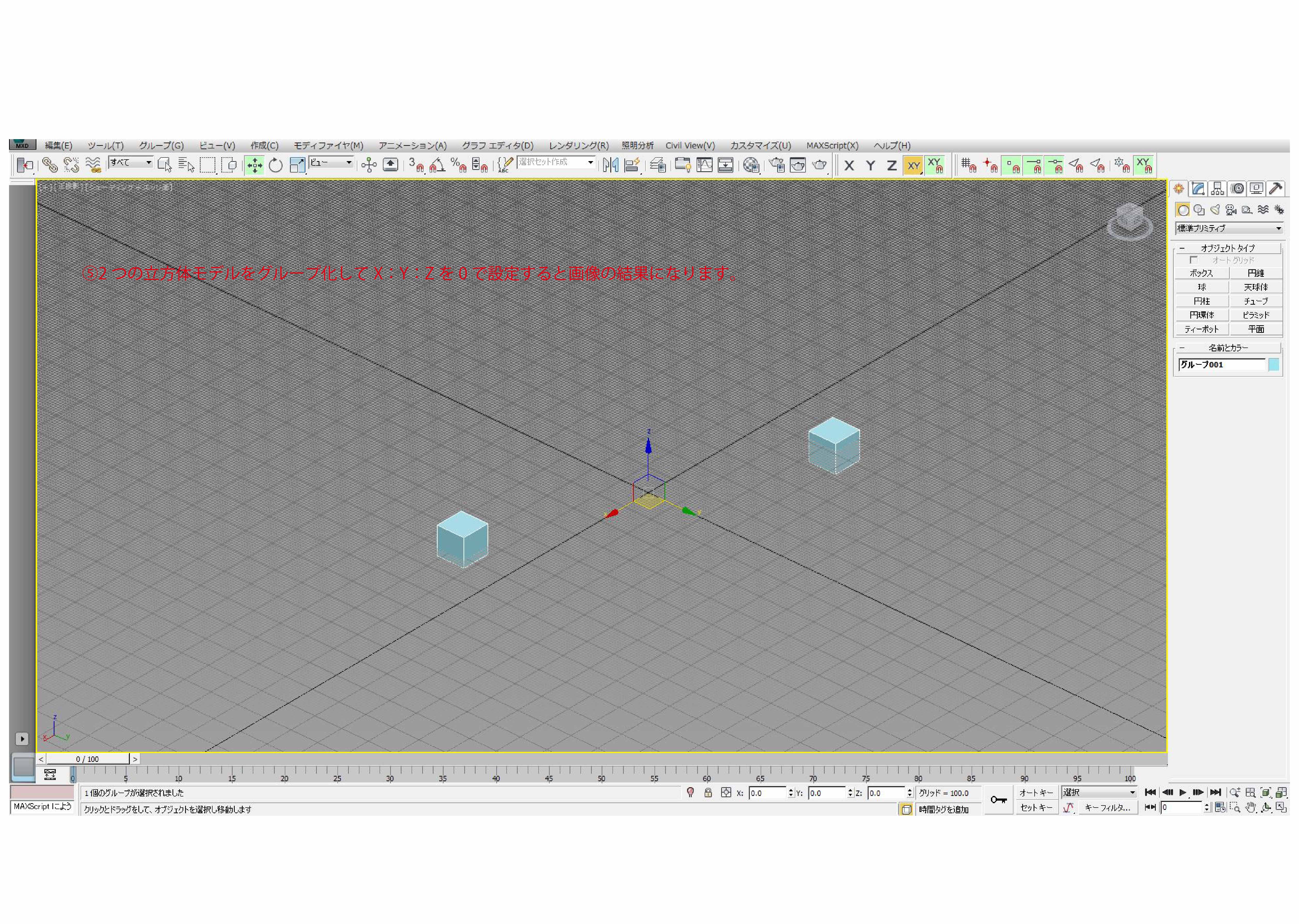 ⑤2つの立方体モデルをグループ化してX:Y:Zを0で設定すると下画像の結果になります。
