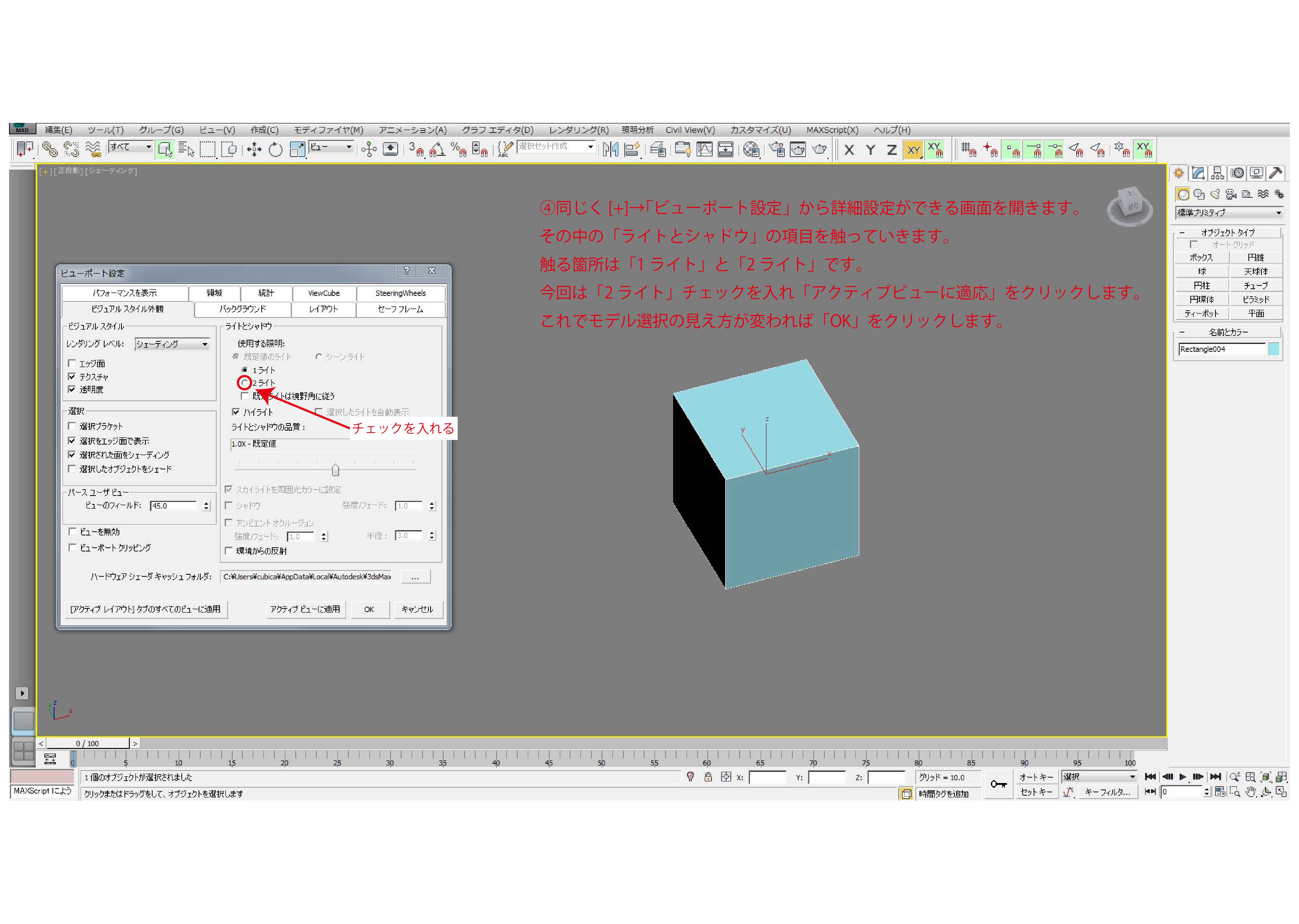 今回は「2ライト」チェックを入れ「アクティブビューに適応」をクリックします。