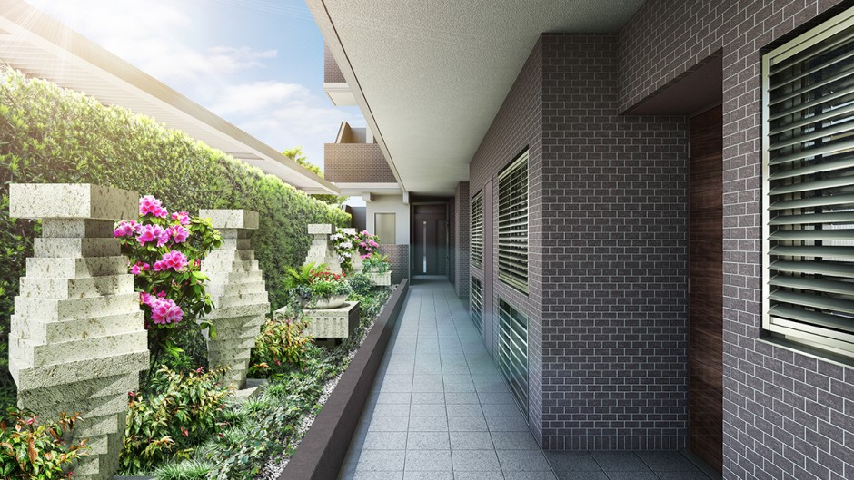 | コメント | アプローチに続く北側の廊下部分。 隣地との空間が狭く、購入者が危惧を持たないようなデザイン。 素材も吟味された。廊下のタイル、壁面のタイル、隣地接する塀の緑化とグリーンスペース。 事業主が提案する生活空間、建築素材の持つ表情をできるだけ忠実に表現した。 |