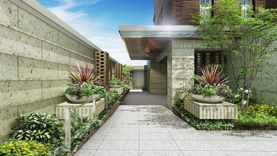| コメント | 小規模ながら高級感溢れるマンションへのアプローチを表現。 この地域は高級住宅地であり、低層(3回程度)しか建築許可されない地域。 何度もデザイン検討され、外装素材も相当数精査し検証された。素材が変更になる都度パースは修正され、本案に決定した。 それだけに、大谷石の表情には神経を尖らせた画像。 午前8時、朝の雰囲気を感じて頂ければ・・・ |