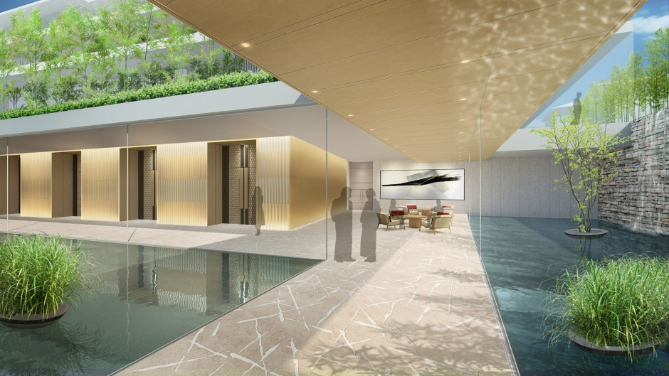 この建築パースのポイントは、静かな水の表現です。水を湛える池の水面の様子を本物のようにすることで静寂を表現しています。天井に反射した光の揺らぎも表現しています。建築パースでは、光と影、素材の質感を本物のように表現することが重要ポイントになります。
