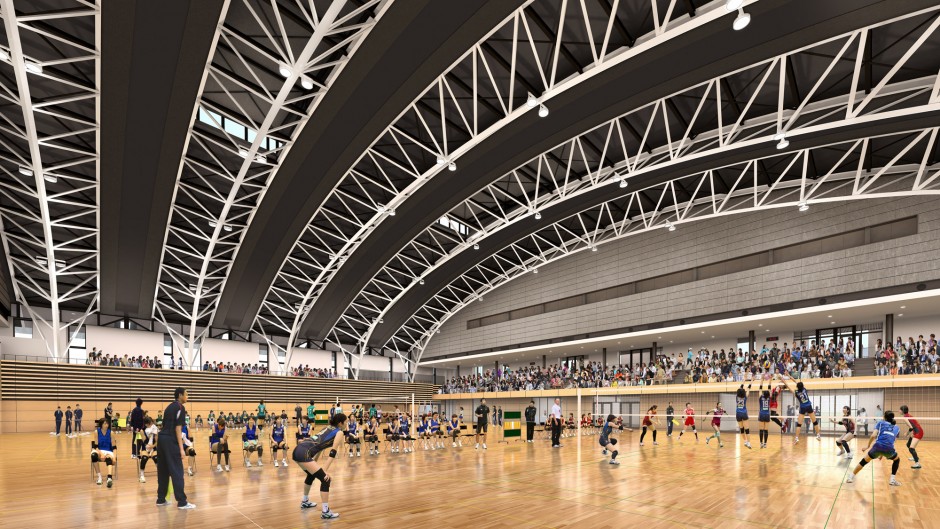 ポイントとしては、設計意図と設計趣旨を理解して作ったところです。 体育館内で実際に人がスポーツをしたり、観客が見たりしているイメージを忠実に示しています。 また学校の体育館なので、満員ではなく実際に入るであろう人数を配置しています。 屋根は、設計書に示されていた通り、トラス構造の表現を作りました。 同じ体育館の外観パースと併せて、2週間で製作いたしました。 |